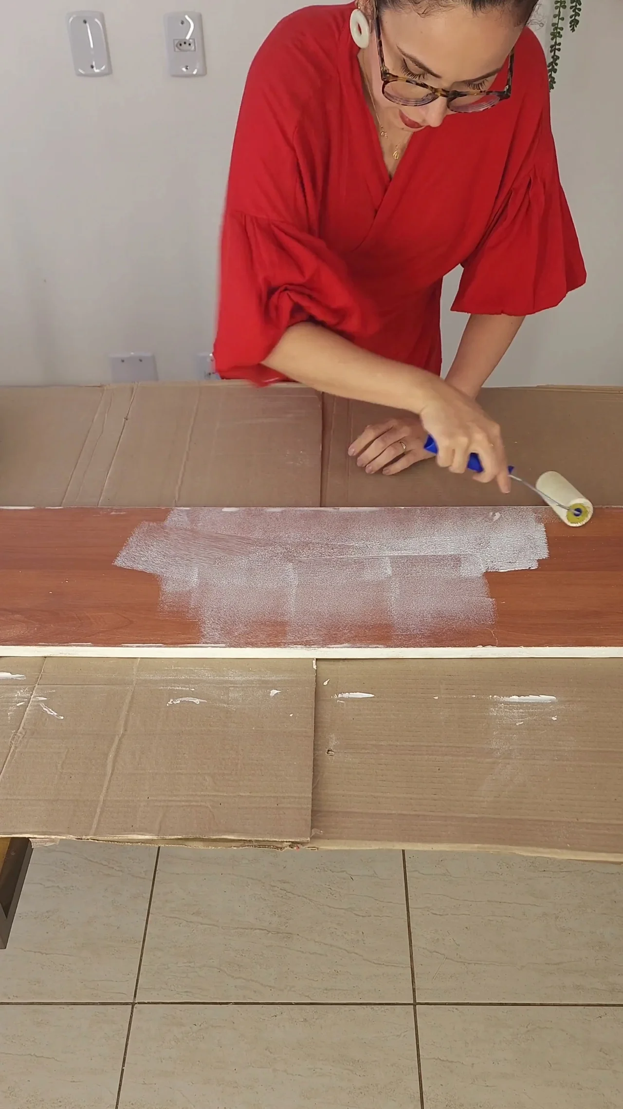 Com os nichos prontos, chegou a hora de pensar no tampo do aparador. Para isso, eu recorri a uma das partes que mais gosto do meu trabalho: a decoração sustentável com garimpo de peças. Nesse caso, eu fui até a casa da minha vizinha, que tinha uma porta de guarda-roupa em casa que estava sem uso.