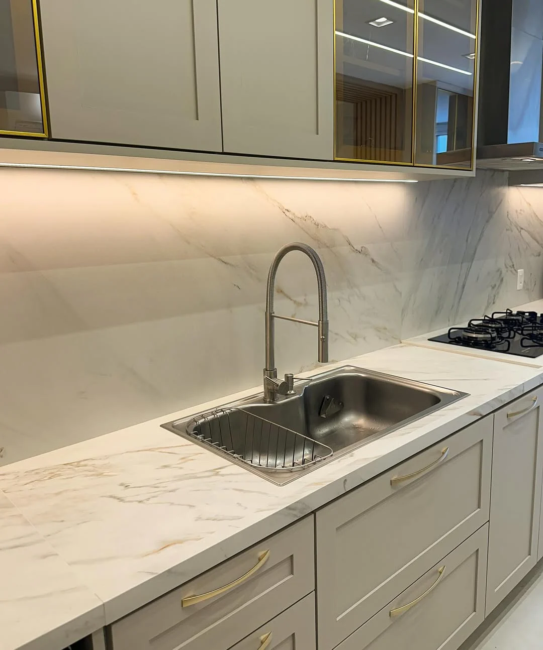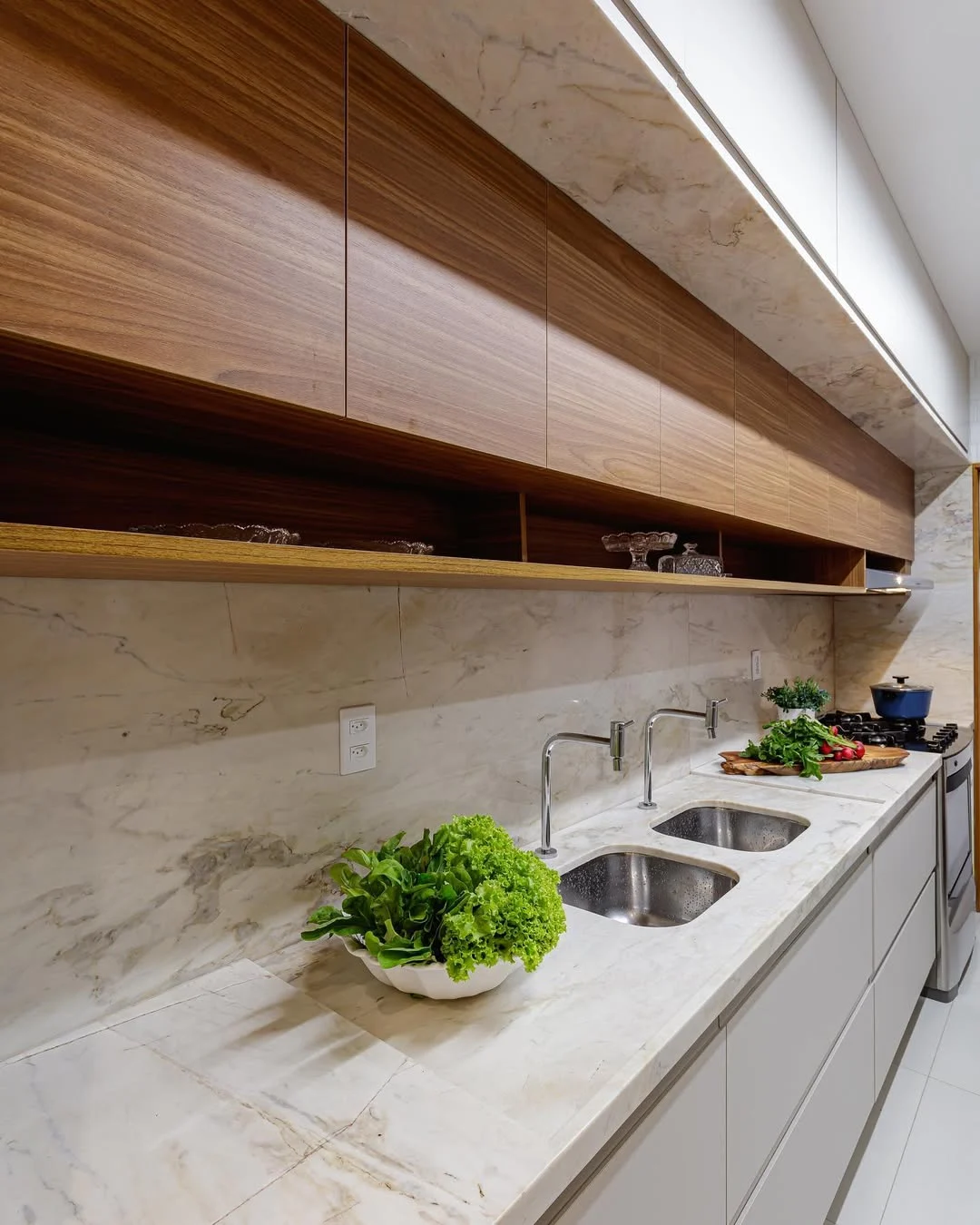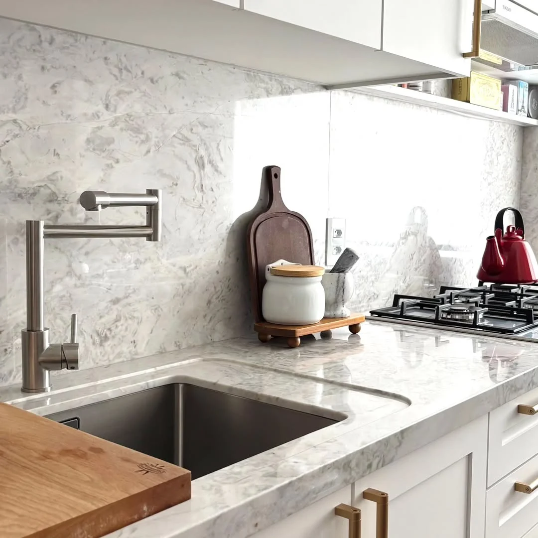 Embora tenha esse contratempo, as bancadas de mármore têm um apelo estético incrível. Se você gosta de algo bem elegante, a combinação com metais dourados ou pretos pode trazer um visual bem chique.