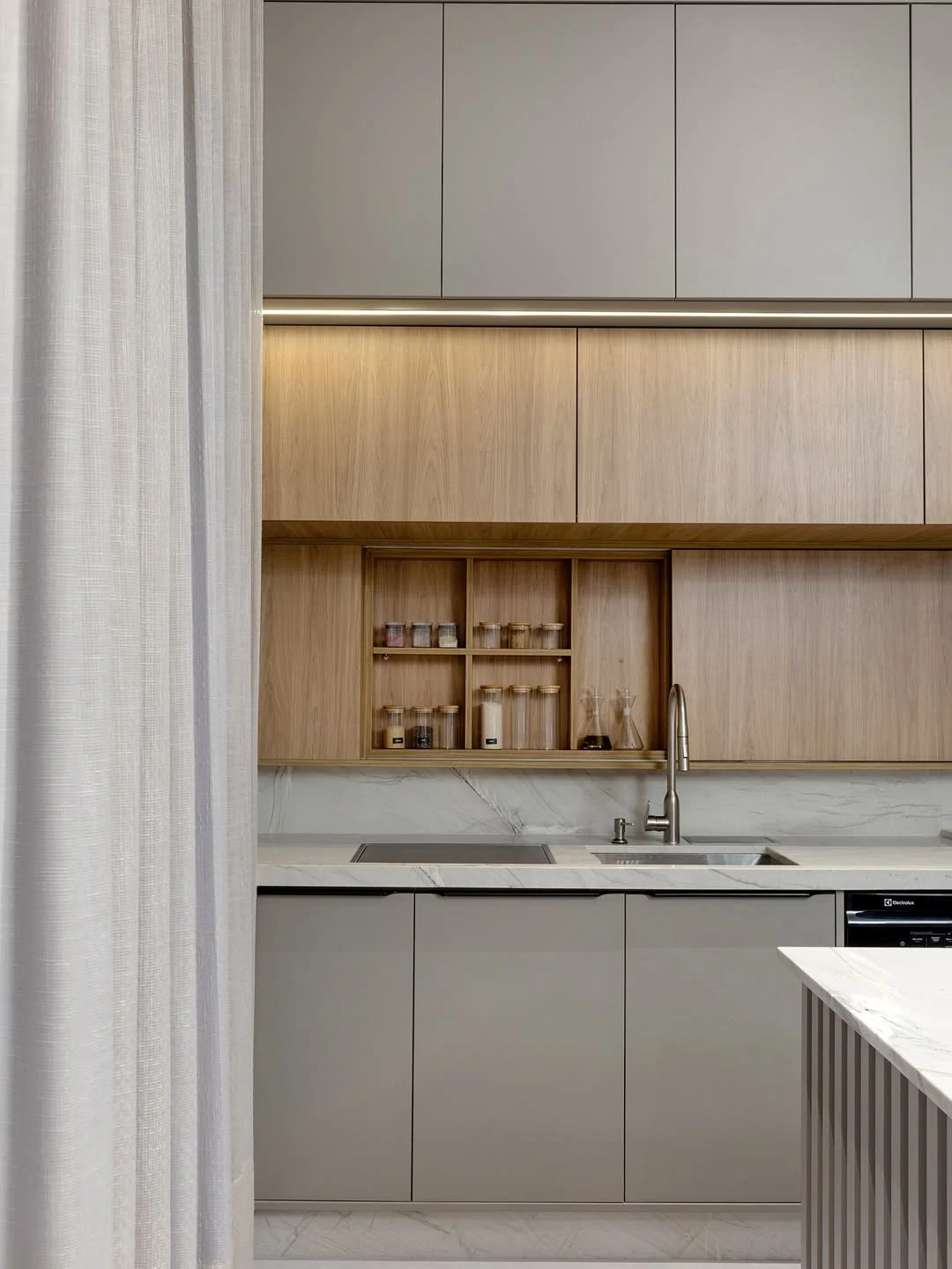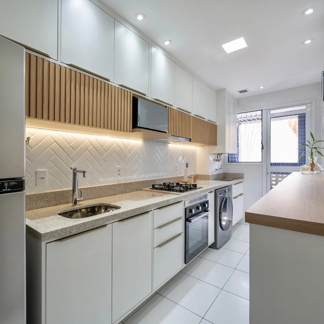 Além disso, considere também o espaço disponível na sua cozinha, porque isso determina o uso dela. Se você tem um ambiente mais compacto, então é essencial que seja algo mais prático e funcional. Dá até para considerar colocar alguns compartimentos, como tomadas embutidas e dispenser para sabão.
