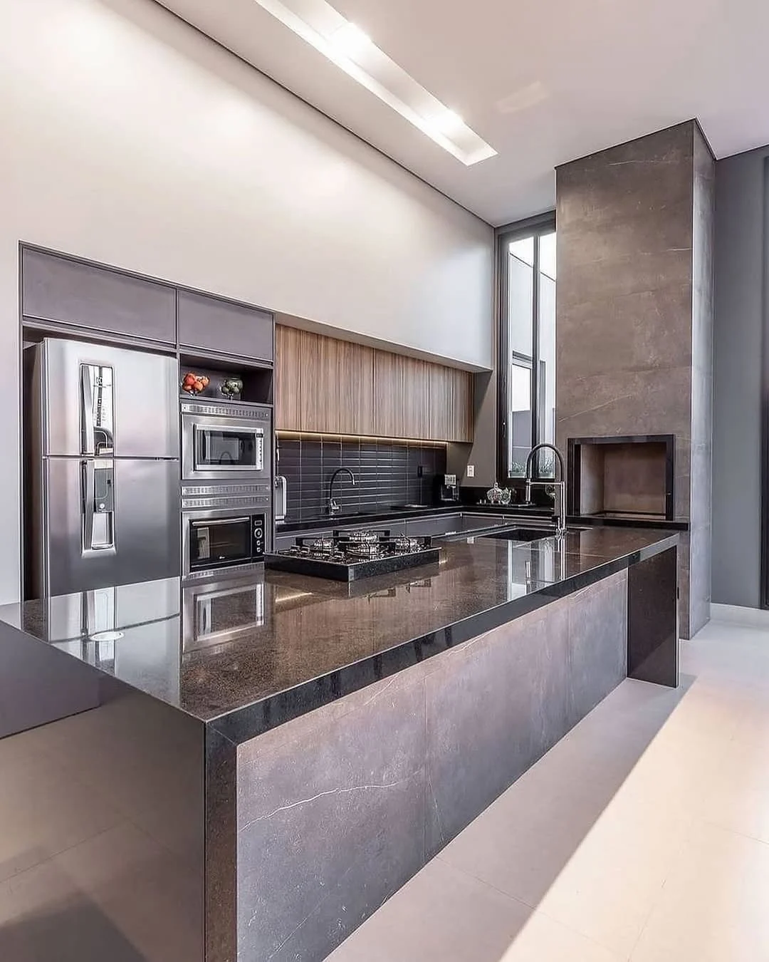 Todavia, se a sua cozinha é bem espaçosa, que tal investir em uma bancada maior? Aqui, você pode até se aventurar em uma área de preparo bem grande, incluindo um cooktop e cubas duplas.