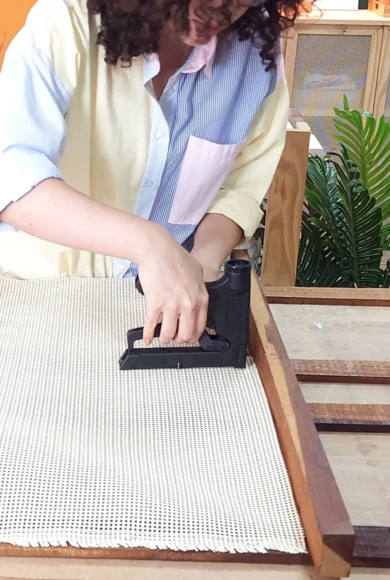 Para fixar esse tecido, vamos grampear ele na parte traseira do estrado de cama. Aqui, uma dica é manter ele bem esticado. Assim, você evita que fique com alguma ondulação no resultado final e dá um acabamento mais profissional.