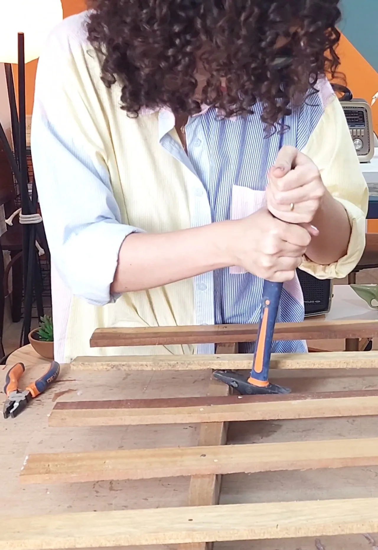 Para fazer essa cabeceira, o primeiro passo foi retirar duas ripas do estrado de cama. A ideia aqui era alterar um pouco do padrão original. Para isso, eu optei por não retirar essas peças de forma aleatória, mas dando um espaçamento bem pensado para o que eu tinha em mente.