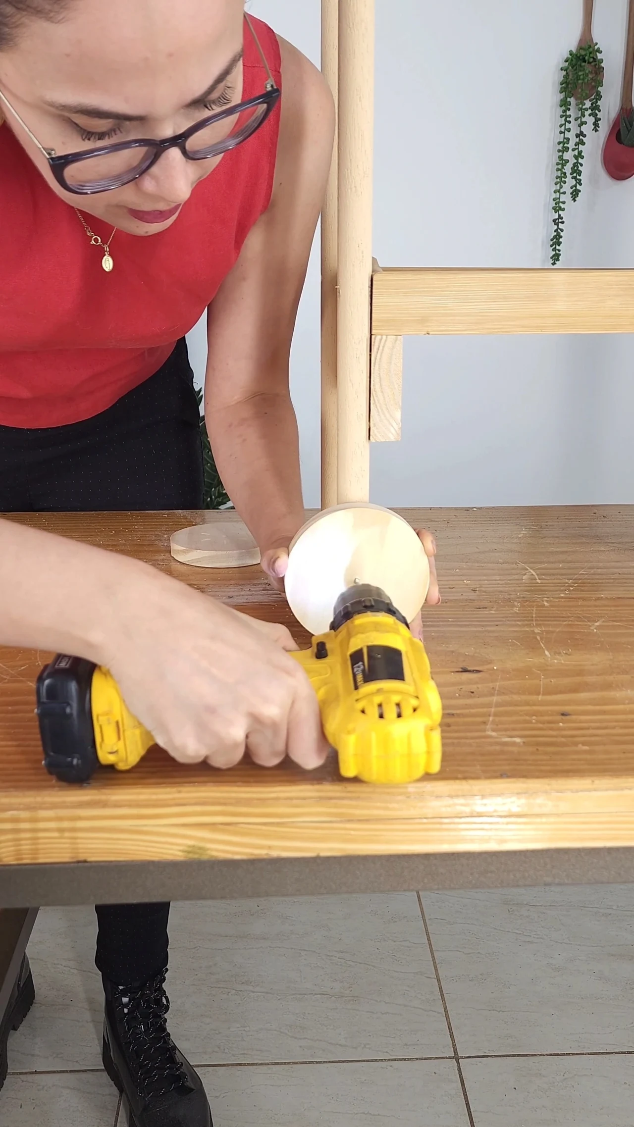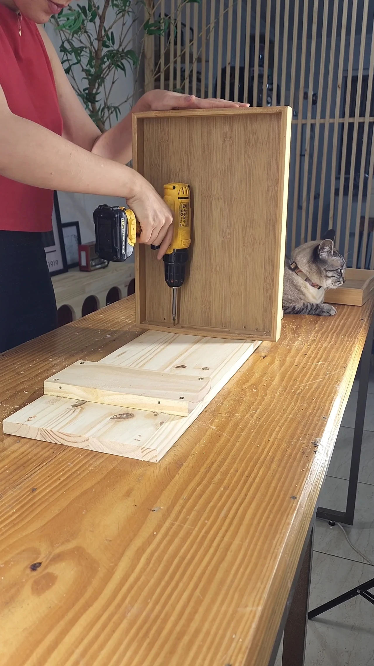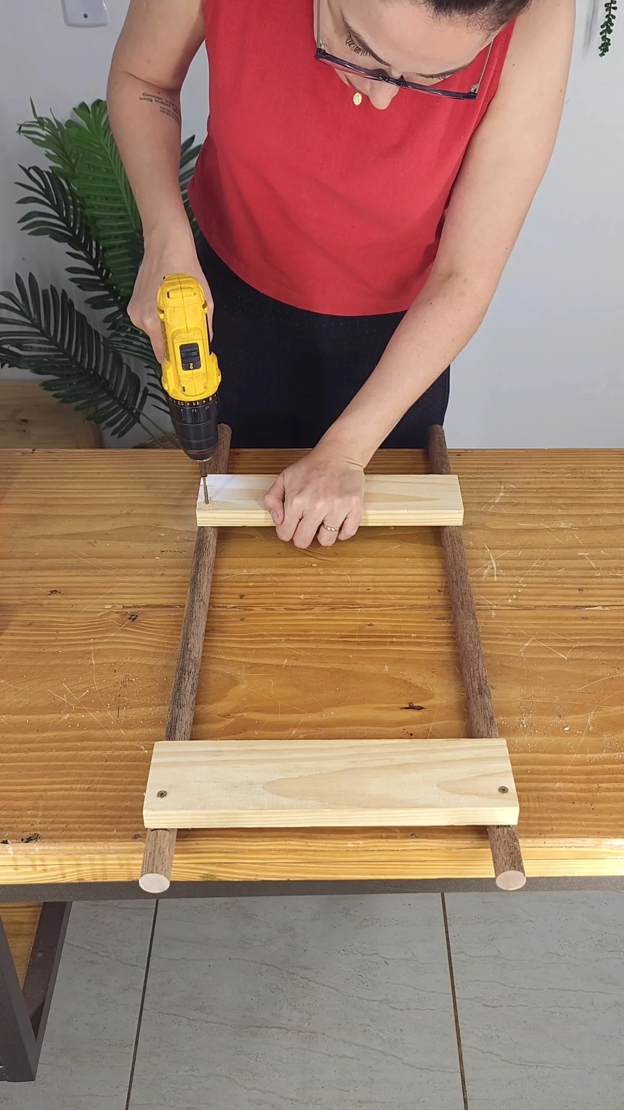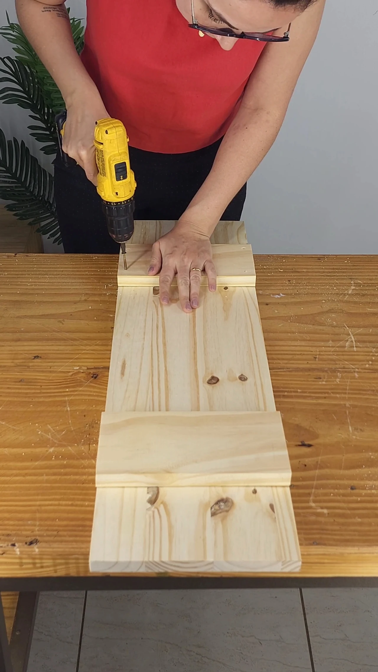 Para reforçar a segurança do nosso móvel multifuncional, depois que estiver tudo colado, você vai vir com a parafusadeira e fixar as ripas na tábua de madeira. É muito importante que essa etapa também siga as mesmas medidas da escadinha, já que elas vão ser complementares.
