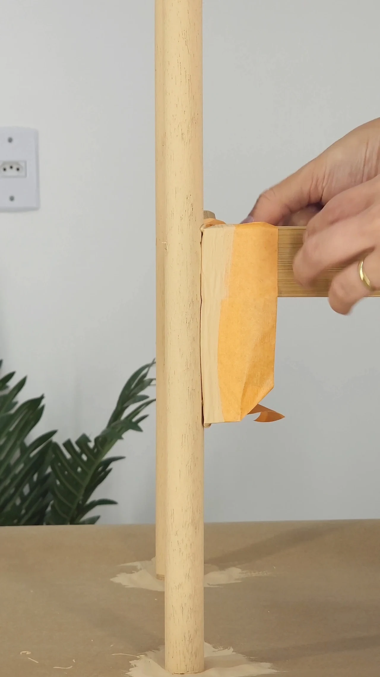 Como eu não quero passar tinta em todo o meu móvel, eu vou usar uma fita crepe para delimitar o espaço. Nos cabos de vassoura, usei uma tinta bege mais quente e com fundo levemente alaranjado, que trouxe suavidade e leveza para o carrinho-bar.