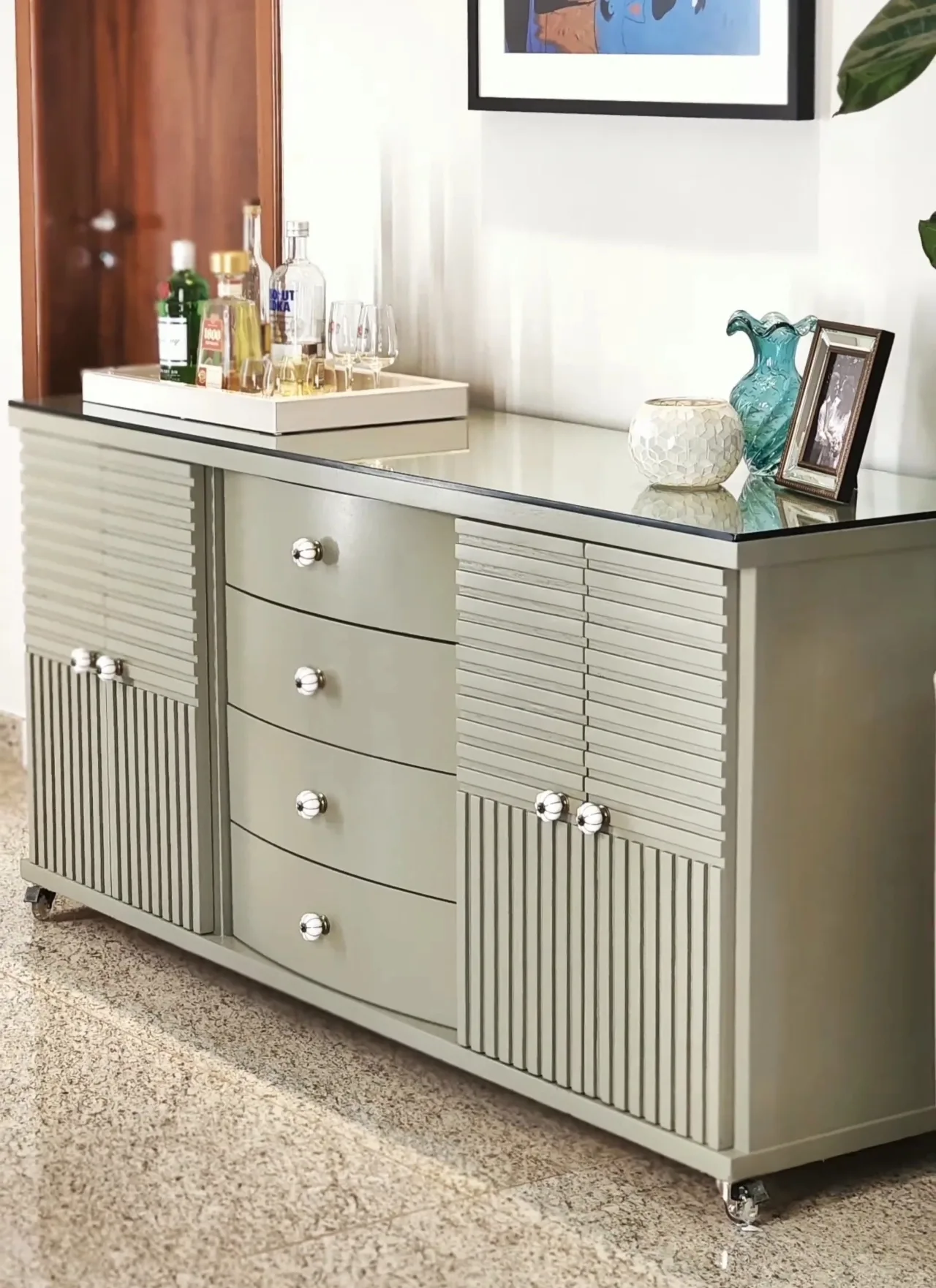 Aparador pintado em tomd e verde claro e delicado, bandeja e vasos em cima.