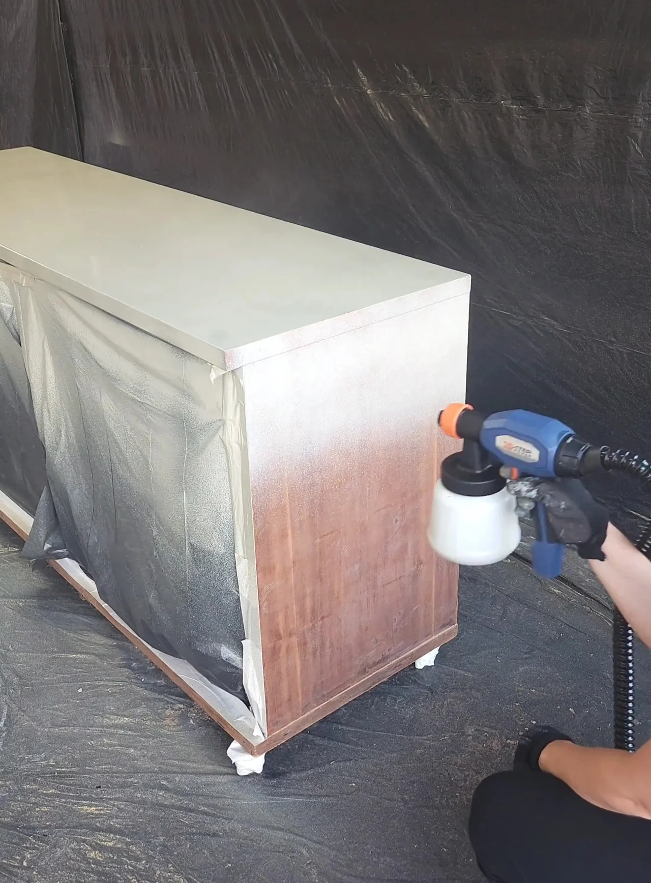 Pintando o aparador antigo com uma pistola elétrica para tinta.