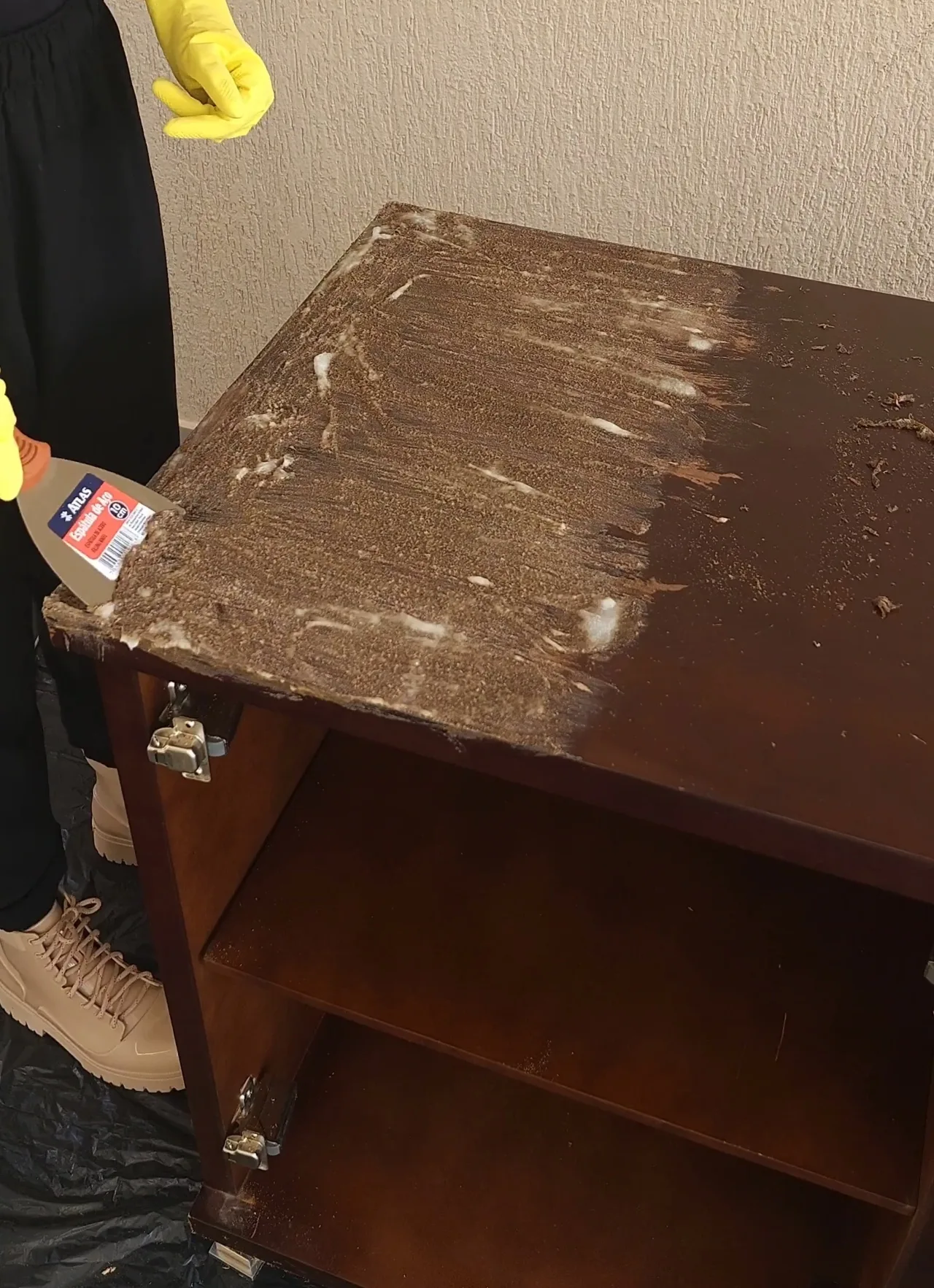 Raspando o verniz antigo do aparador.