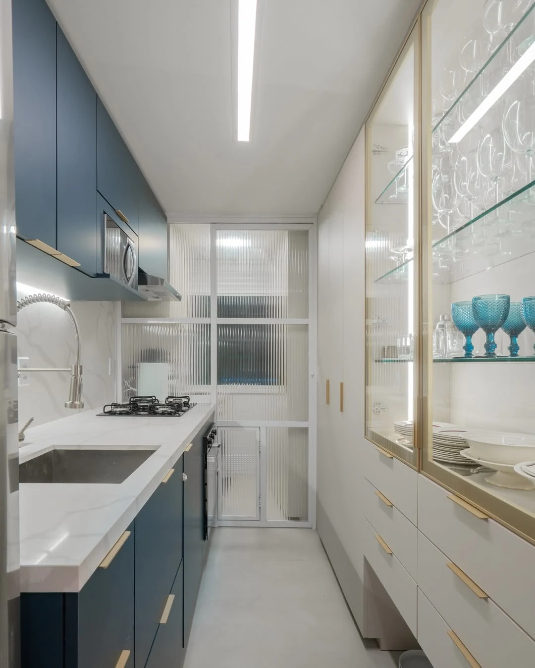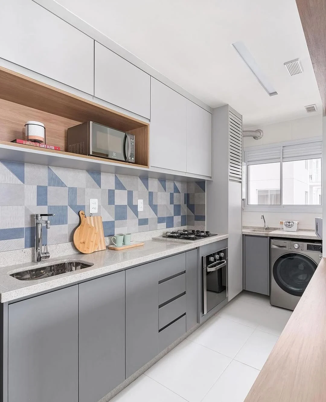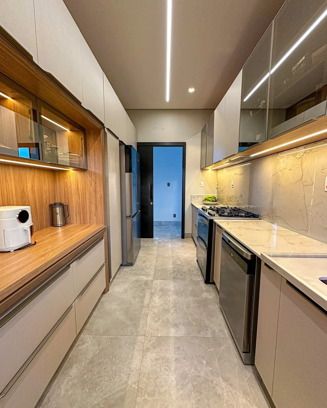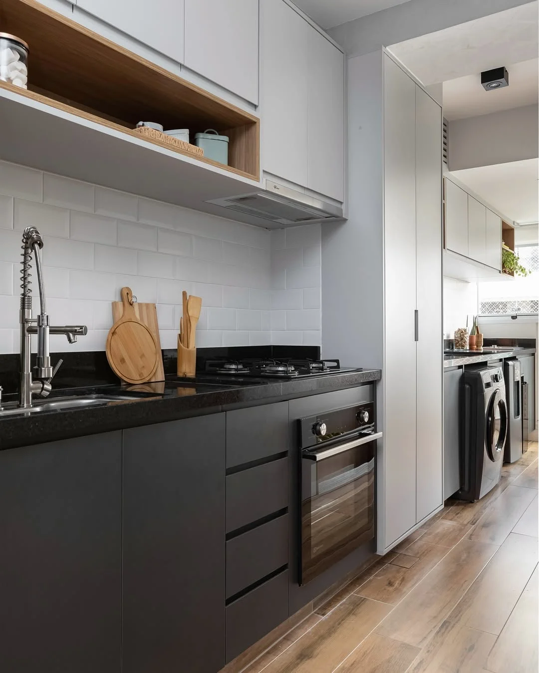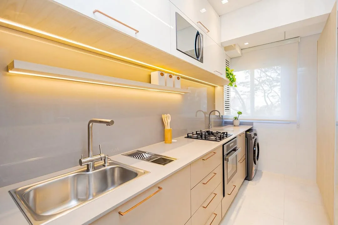 Se a cozinha corredor for integrada à lavanderia, o fluxo precisa ser ainda mais estratégico. Você pode separar visualmente as áreas com marcenaria, portas de correr ou variação de revestimentos, evitando que o uso simultâneo comprometa a circulação. Organização é essencial para que o ambiente não pareça sobrecarregado.