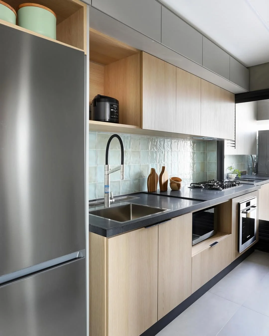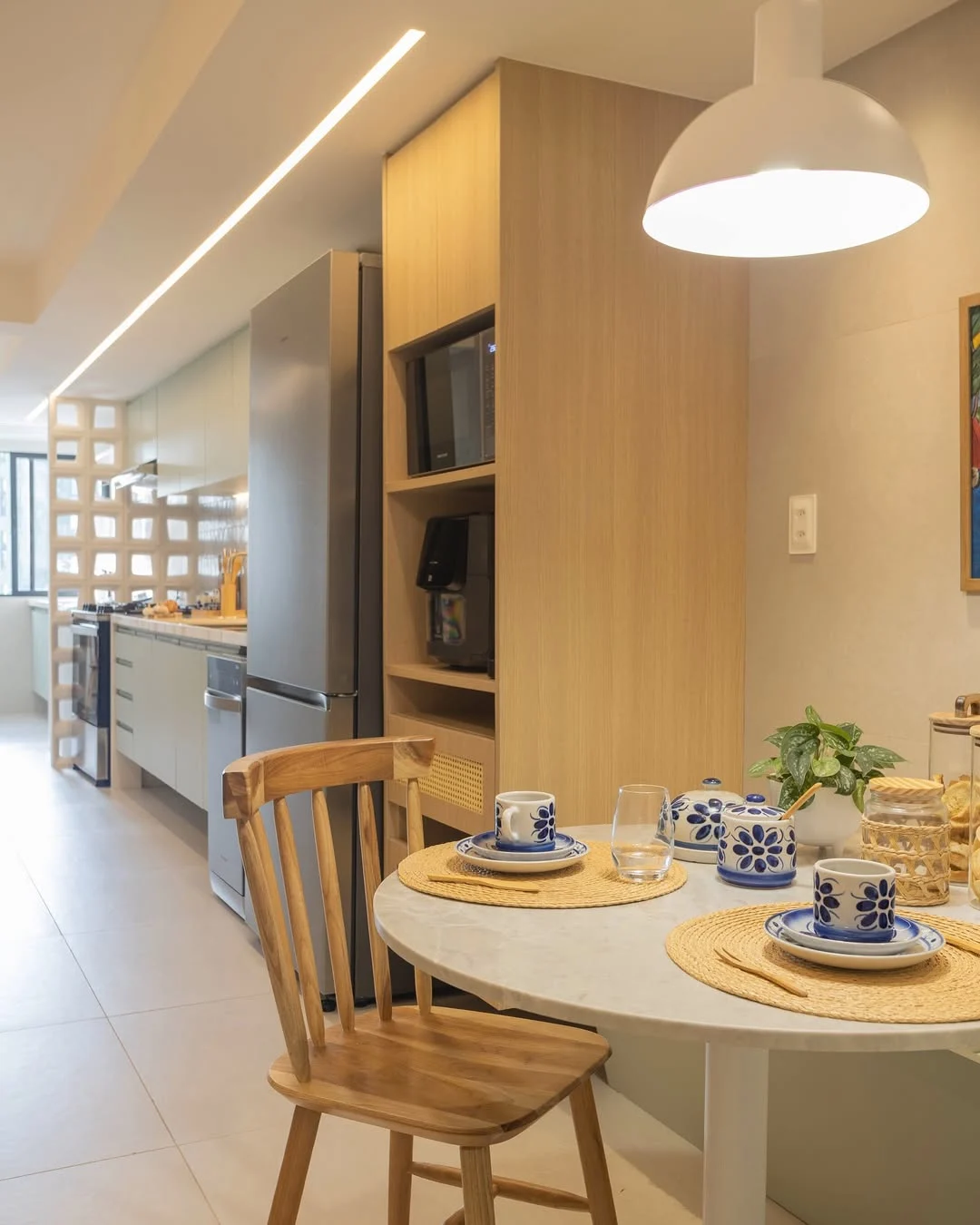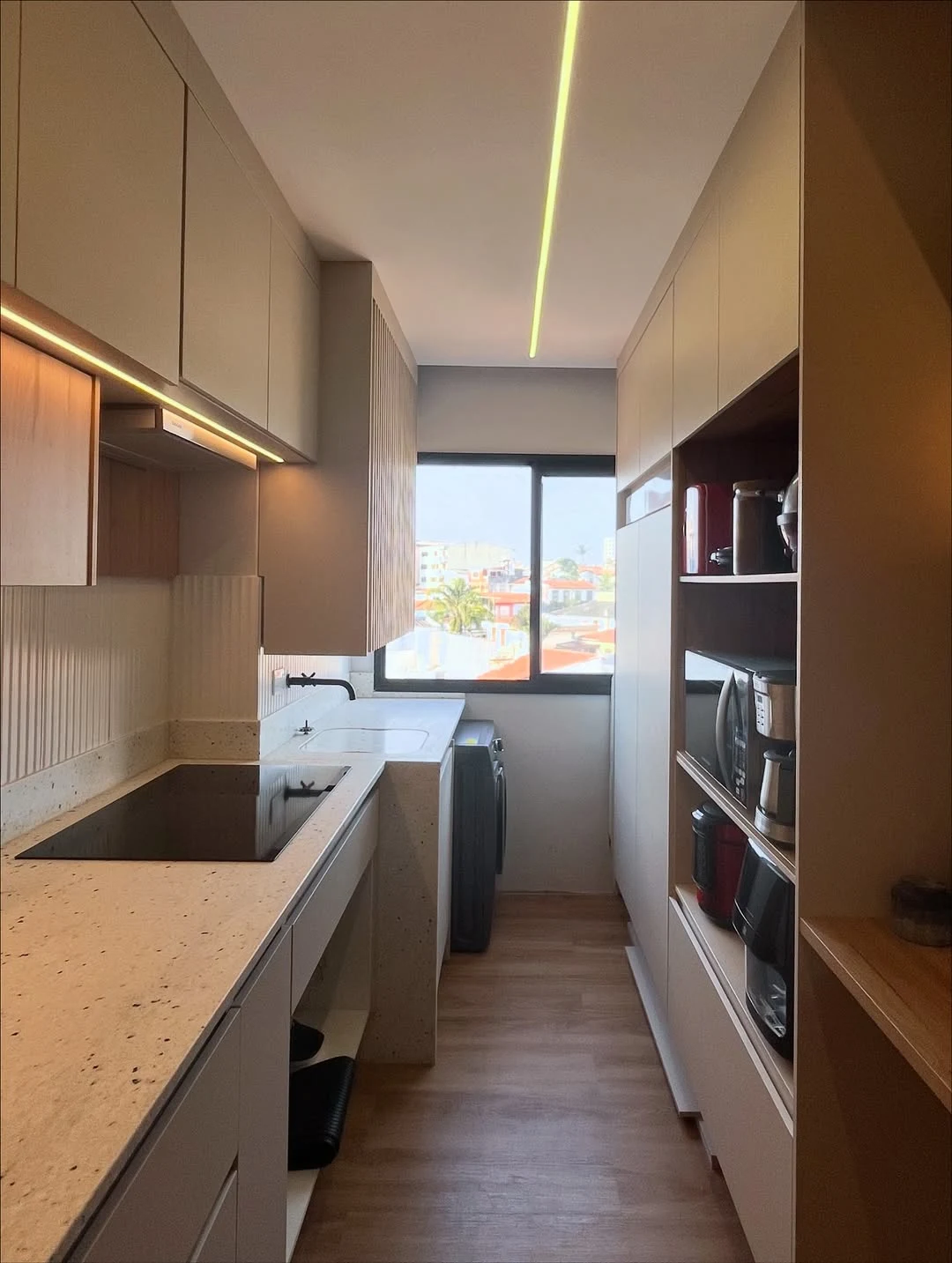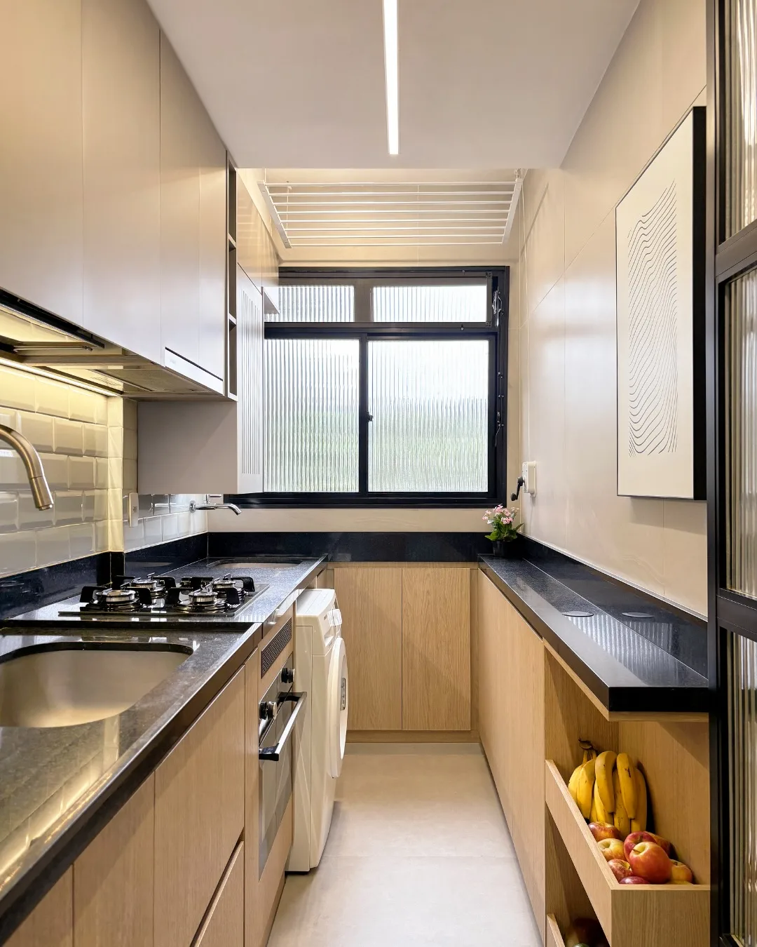 Se a cozinha corredor for integrada à lavanderia, o fluxo precisa ser ainda mais estratégico. Você pode separar visualmente as áreas com marcenaria, portas de correr ou variação de revestimentos, evitando que o uso simultâneo comprometa a circulação. Organização é essencial para que o ambiente não pareça sobrecarregado.