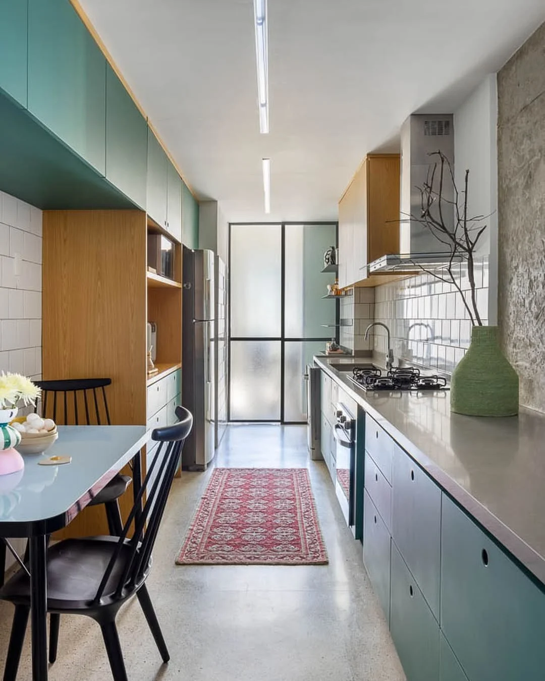 Vidro e aço inox são ótimos aliados em cozinhas estreitas porque refletem luz e facilitam a limpeza. O inox é altamente durável e resistente à umidade, enquanto o vidro pode ser usado em portas superiores para suavizar visualmente o conjunto.