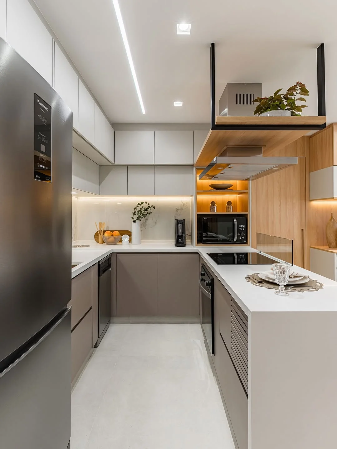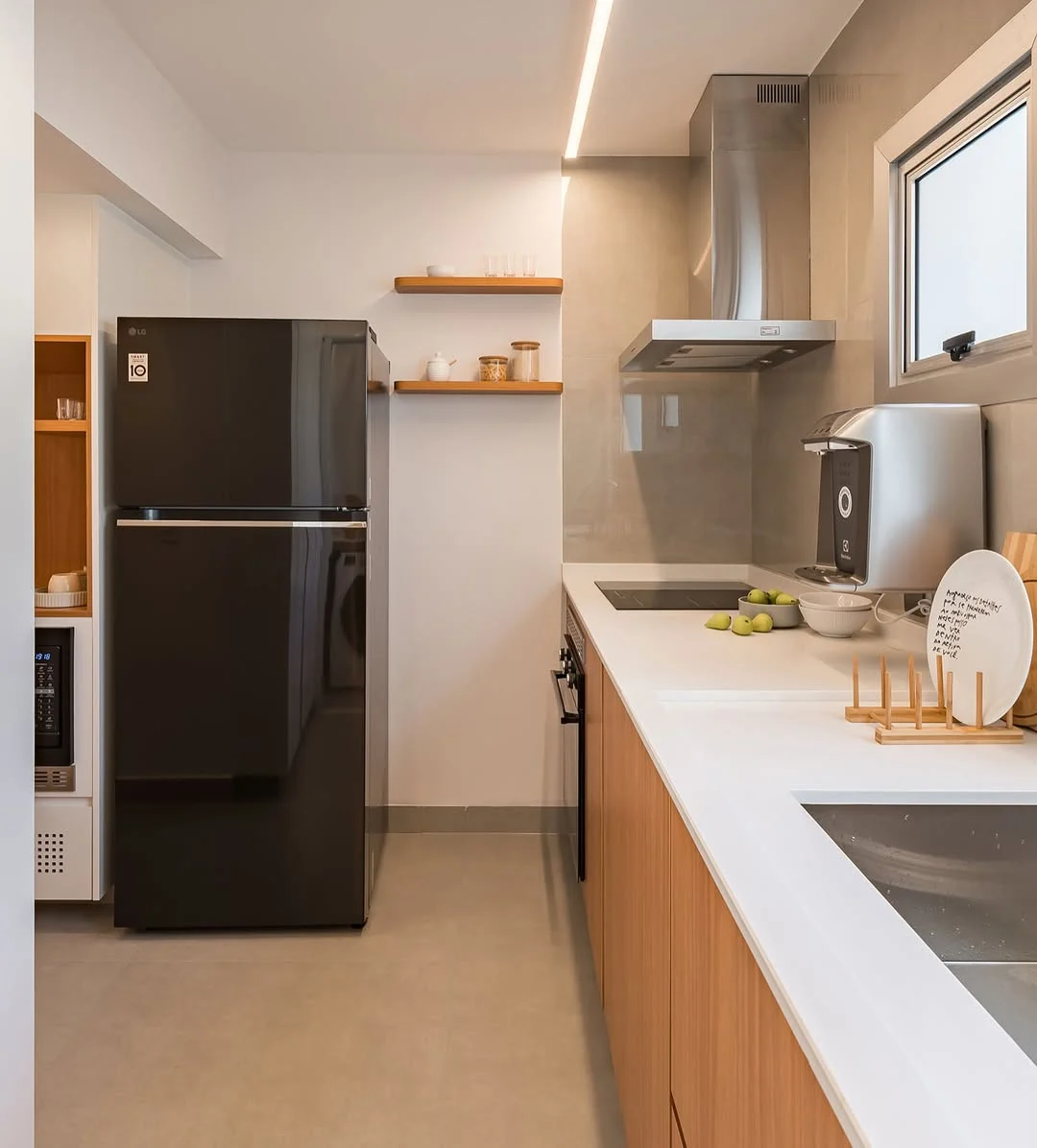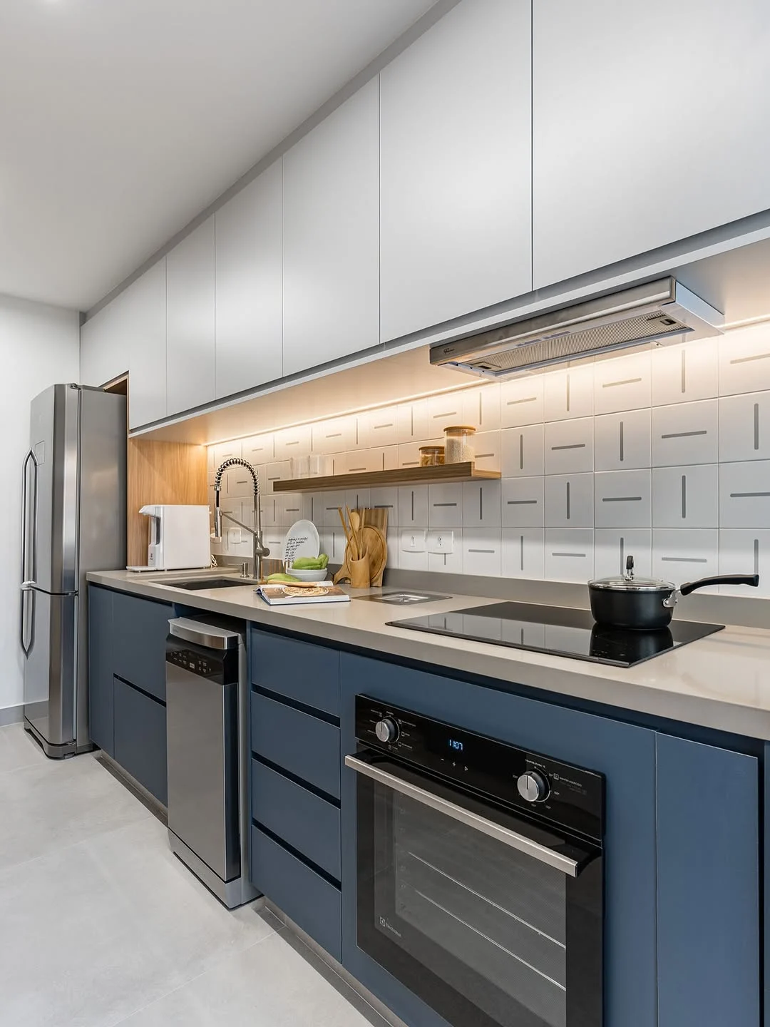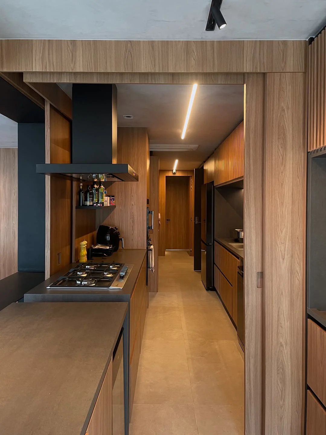 Nesse caso, dá para começar pela iluminação geral. Os plafons ou perfis de LED lineares garantem distribuição uniforme da luz ao longo do corredor. Outro aspecto que ajuda bastante é a luz de tarefa, especialmente se você costuma cozinhar muito! Aqui, ela pode aparecer como spots ou trilhos dependendo do nível da sua necessidade.