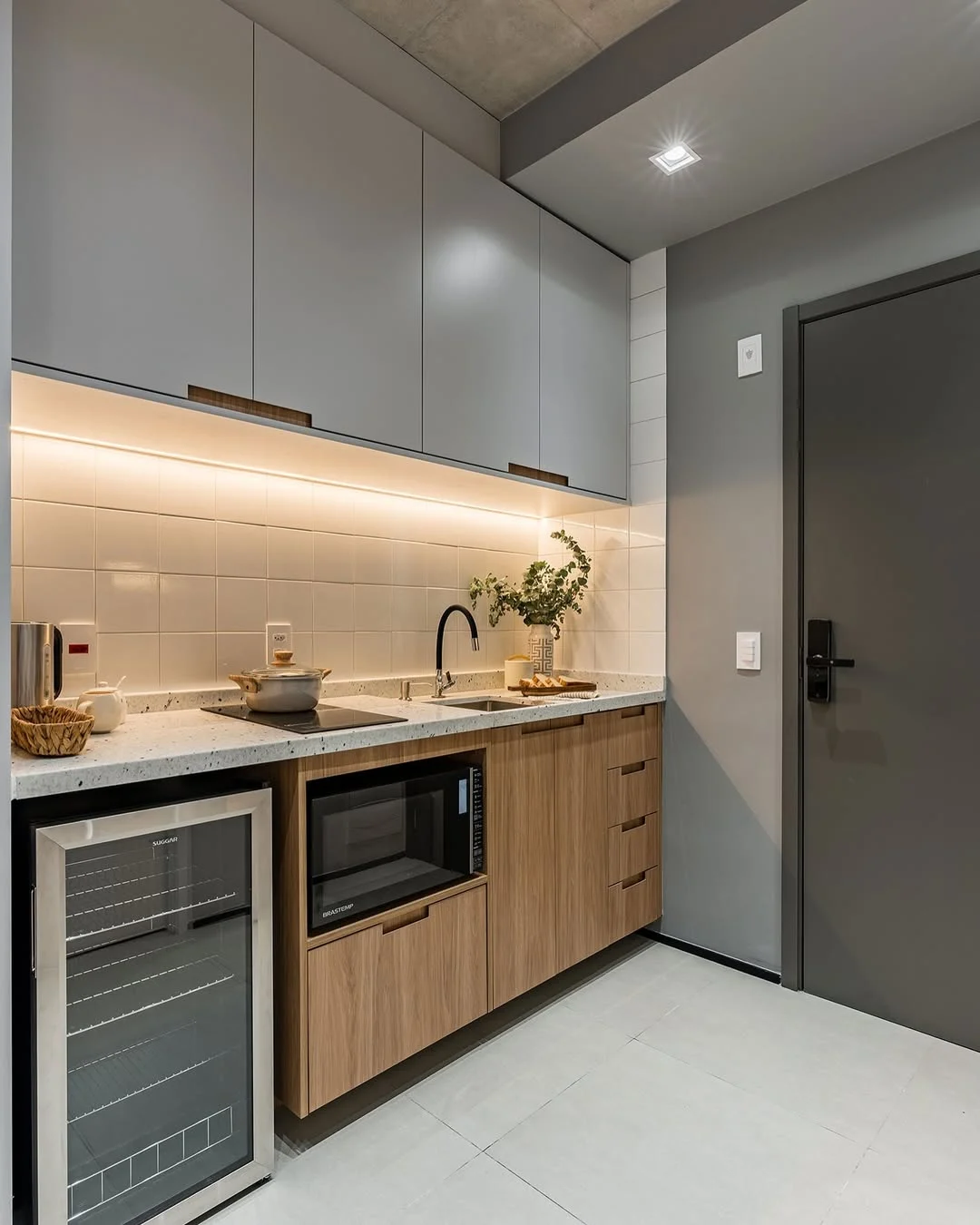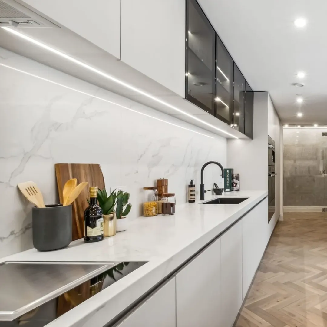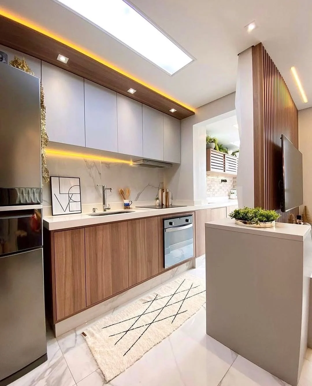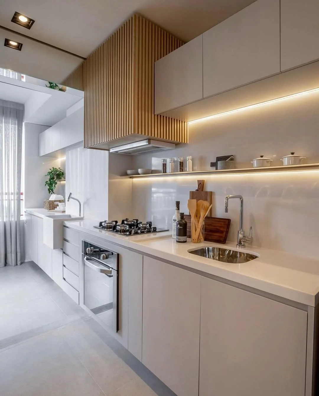 Nesse caso, dá para começar pela iluminação geral. Os plafons ou perfis de LED lineares garantem distribuição uniforme da luz ao longo do corredor. Outro aspecto que ajuda bastante é a luz de tarefa, especialmente se você costuma cozinhar muito! Aqui, ela pode aparecer como spots ou trilhos dependendo do nível da sua necessidade.