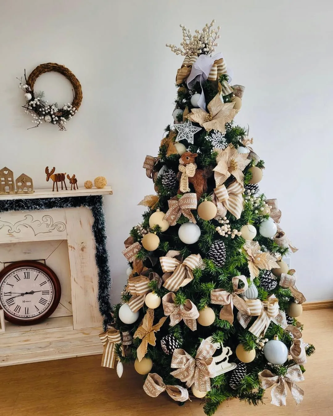 Se você curte o estilo rústico, a sua decoração de natal vai ficar bem acolhedora e aconchegante, cheia de elementos naturais. Essa estética traz um toque de natureza e simplicidade para o ambiente, deixando ele bem mais convidativo.