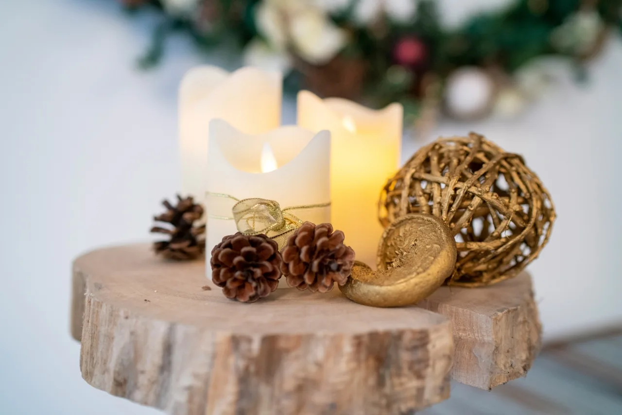 Nos detalhes, também é possível apostar em guirlandas simples e pequenos arranjos. Essa é a hora que você pode aproveitar e colocar uma bandeja de bambu ou madeira clara junto de algumas velas temáticas.