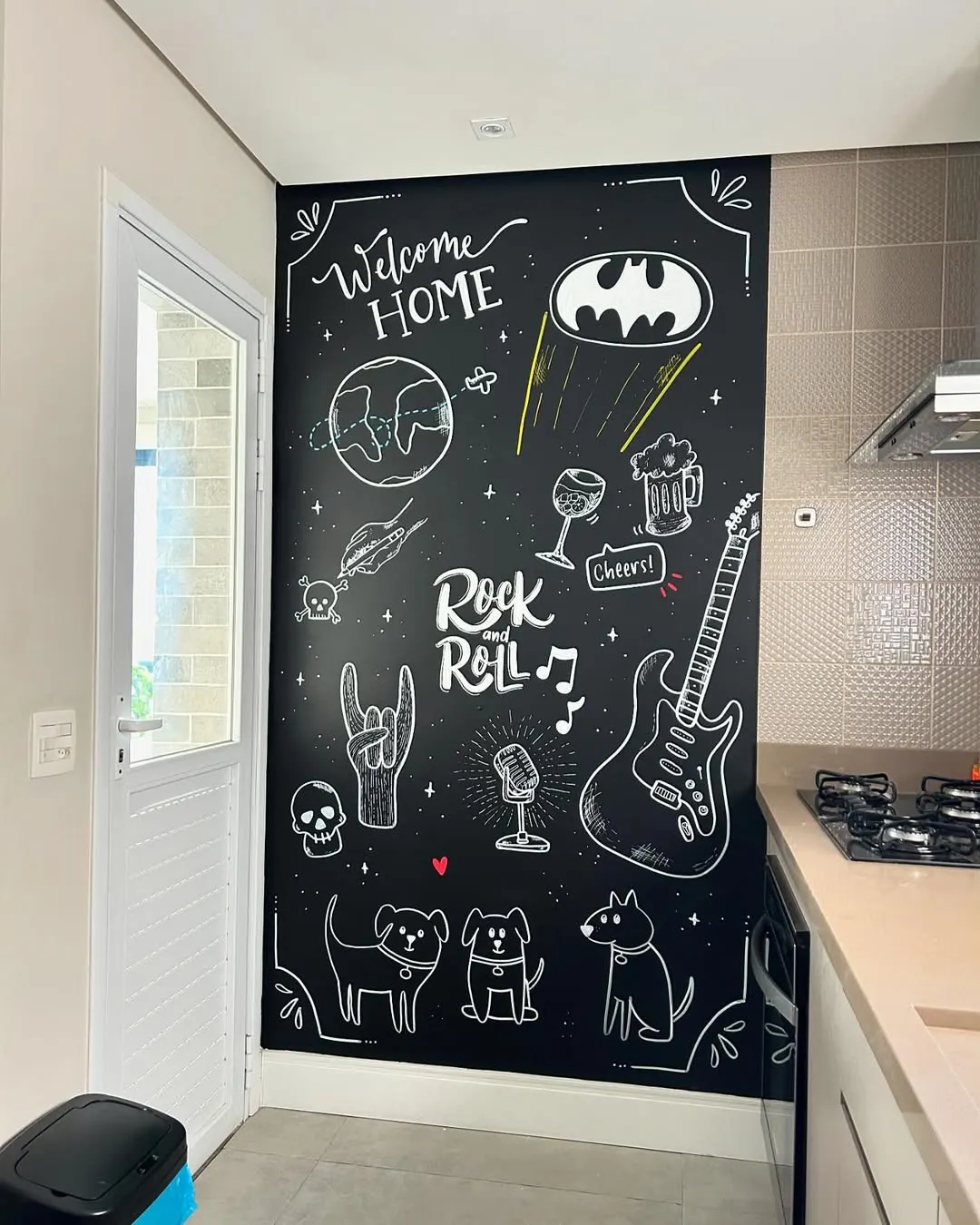 Além disso, o modelo de papel de parede quadro negro tem outro benefício: pode ser removido sem danificar a parede, desde que a superfície esteja bem preparada. Funcionam bem em quartos, escritórios e áreas de estudo.