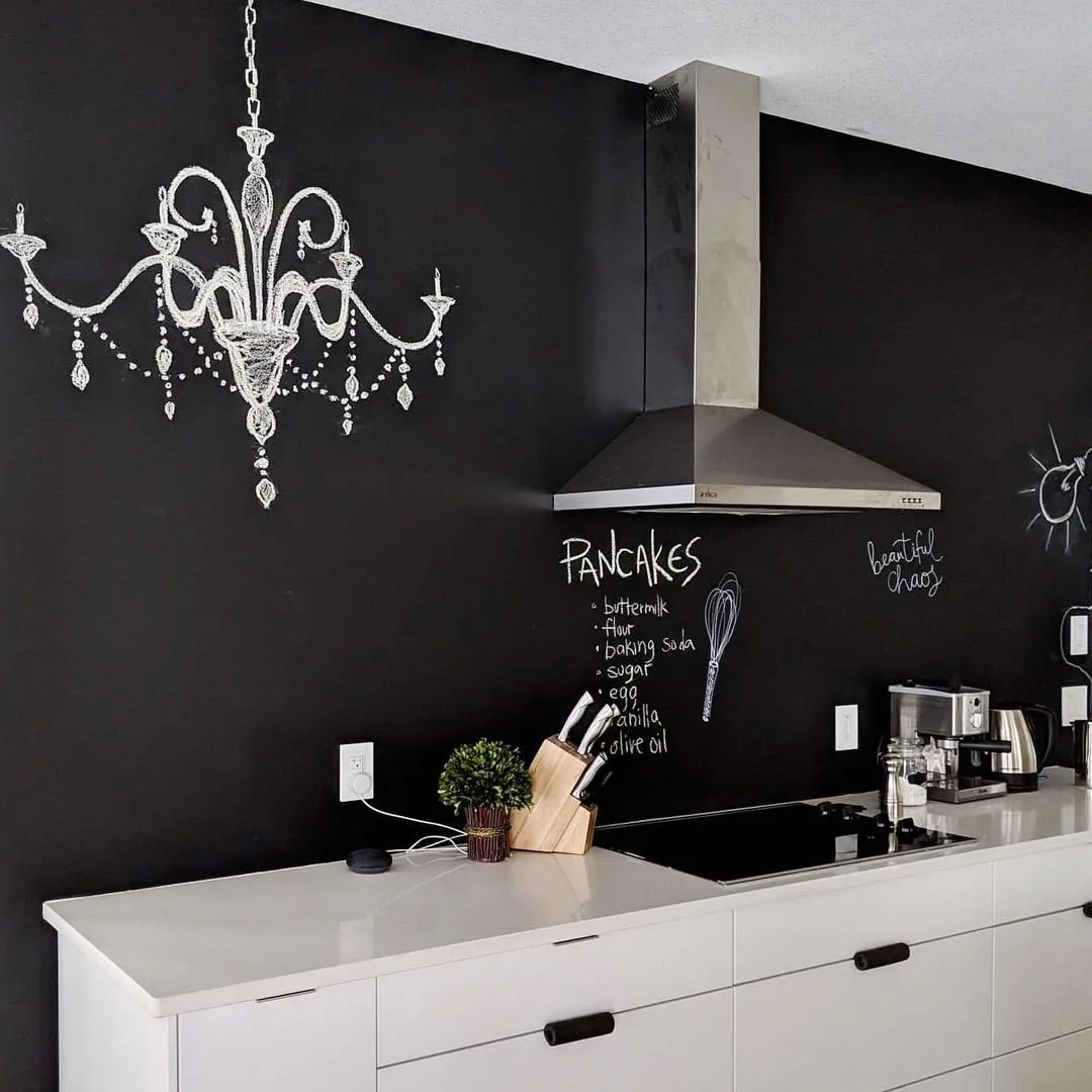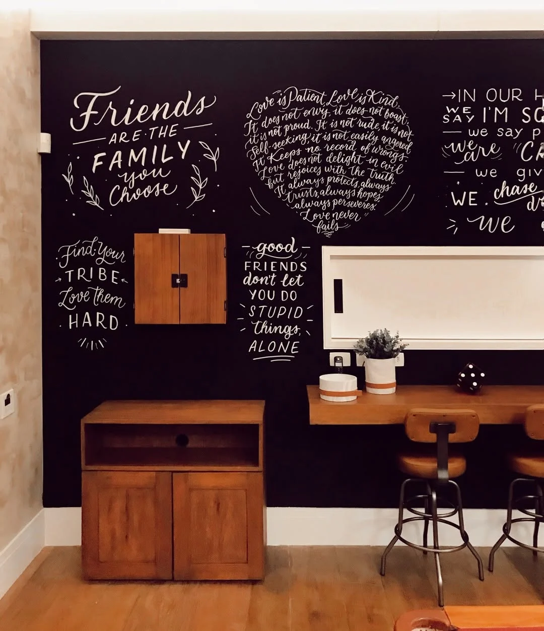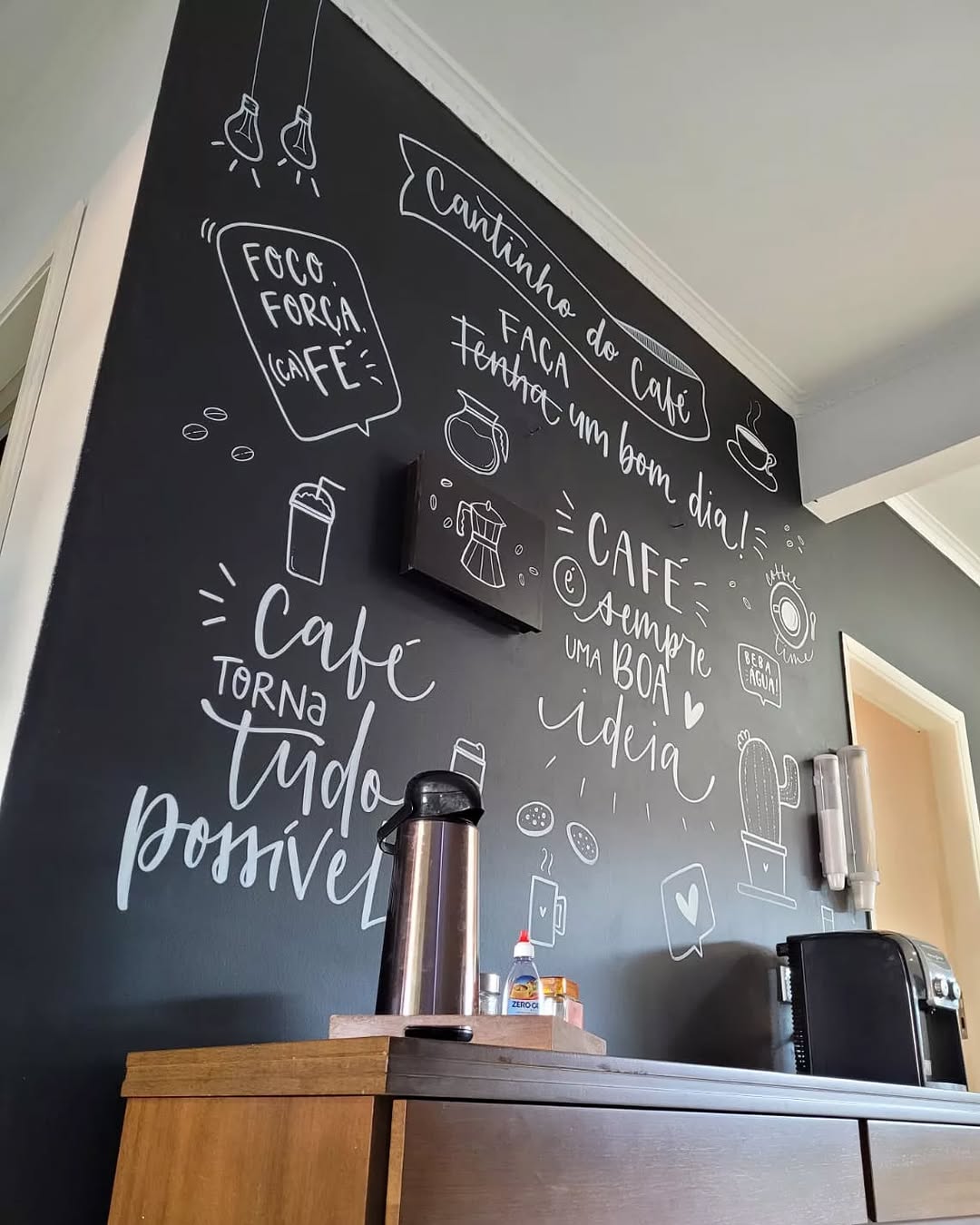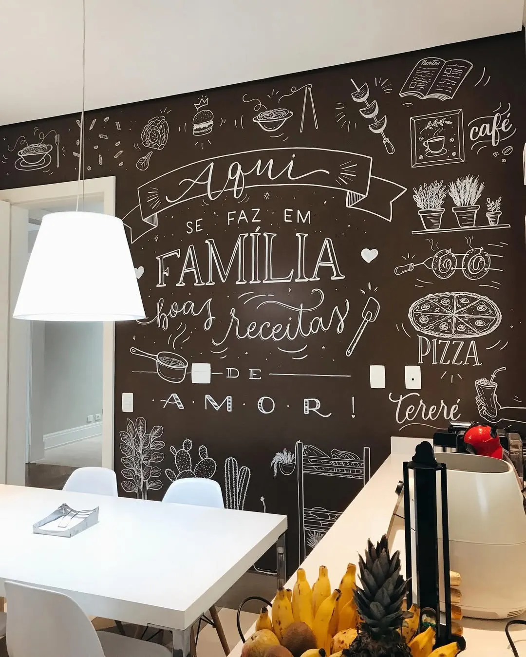 A parede de quadro negro já foi uma das grandes tendências da decoração por volta de 2016. Se você se lembrar bem dessa época, com certeza vai se recordar de ter visto esse tipo de pintura em cozinhas e bares. Muitas vezes, ela era usada para colocar um recado rápido ou uma receita.