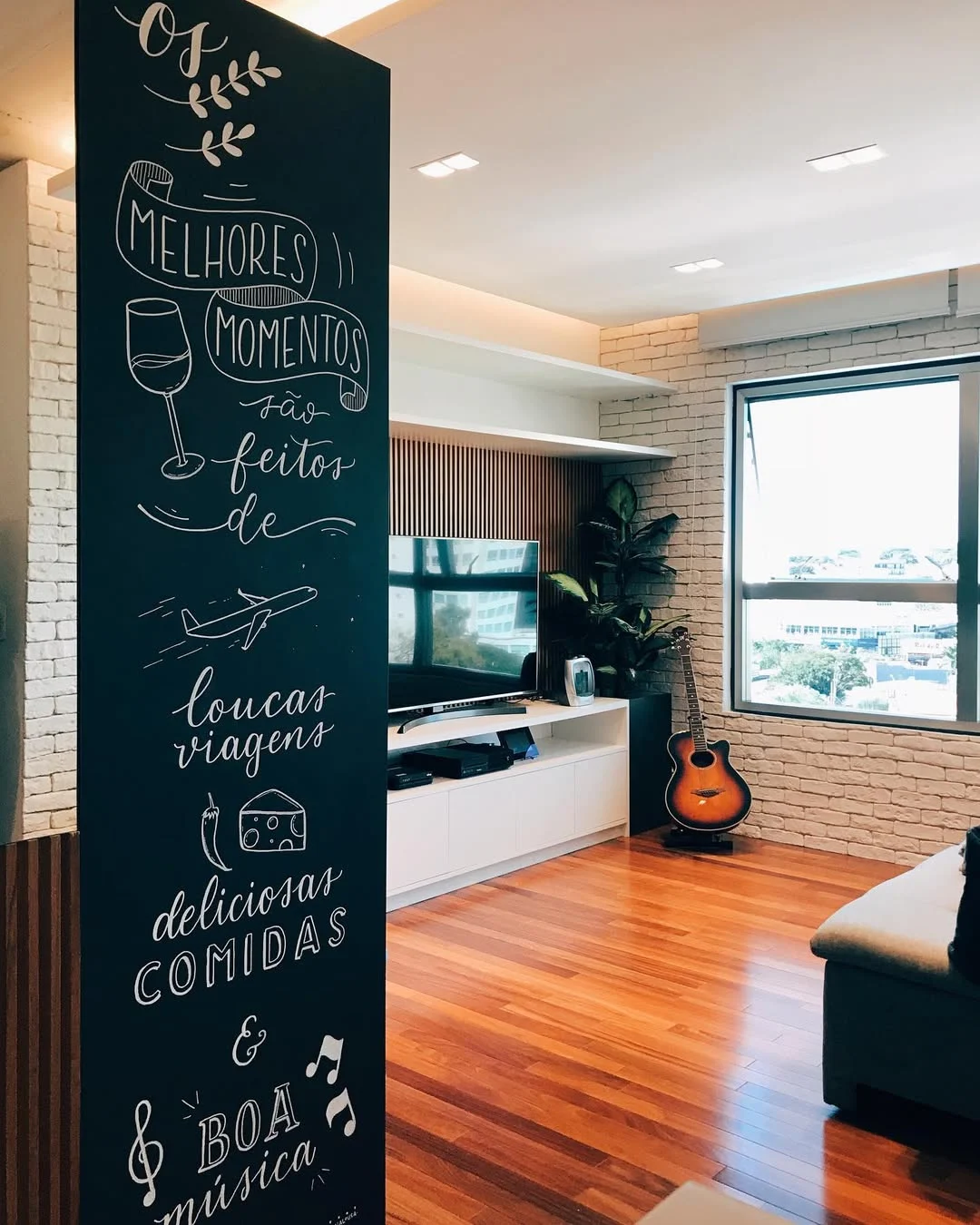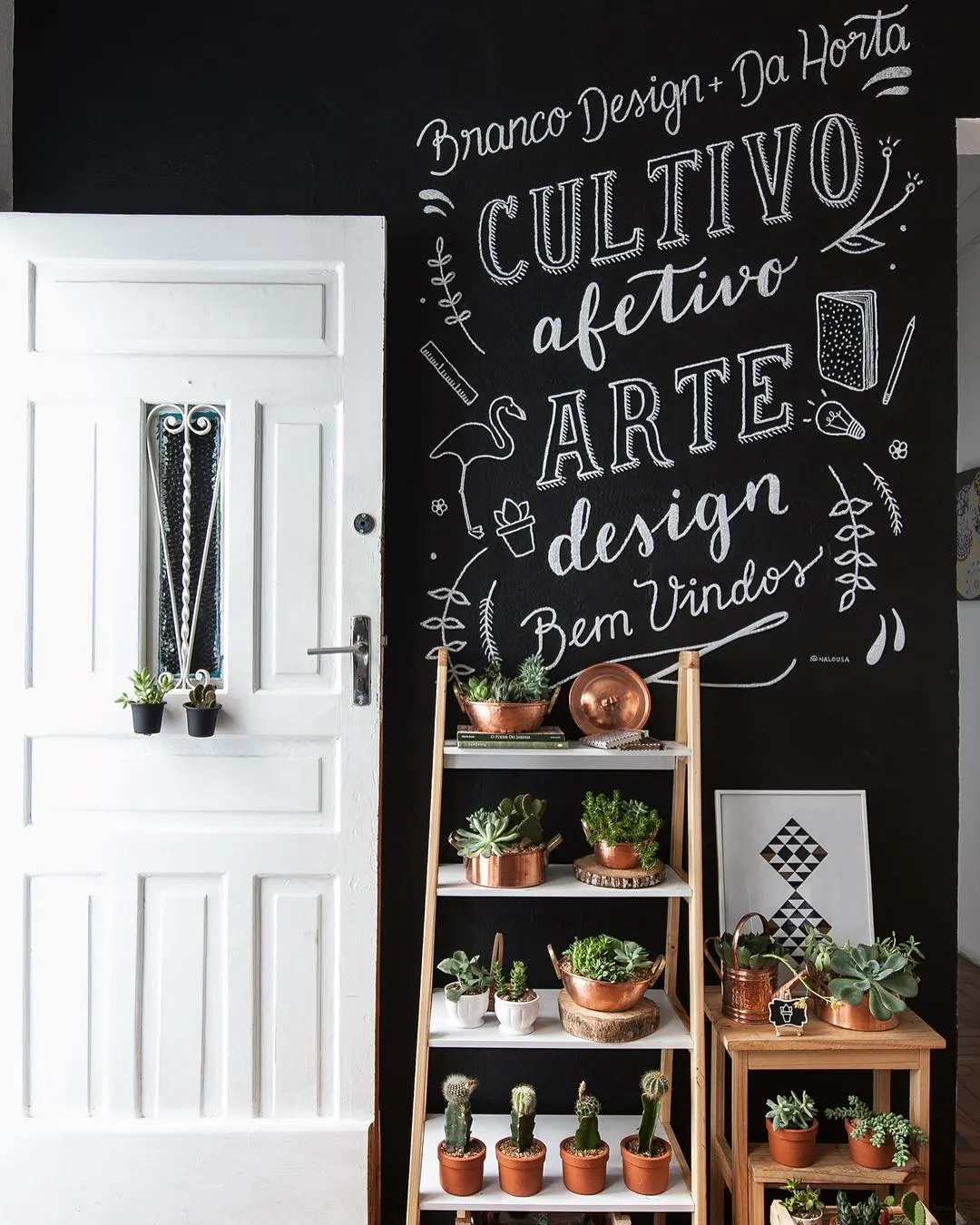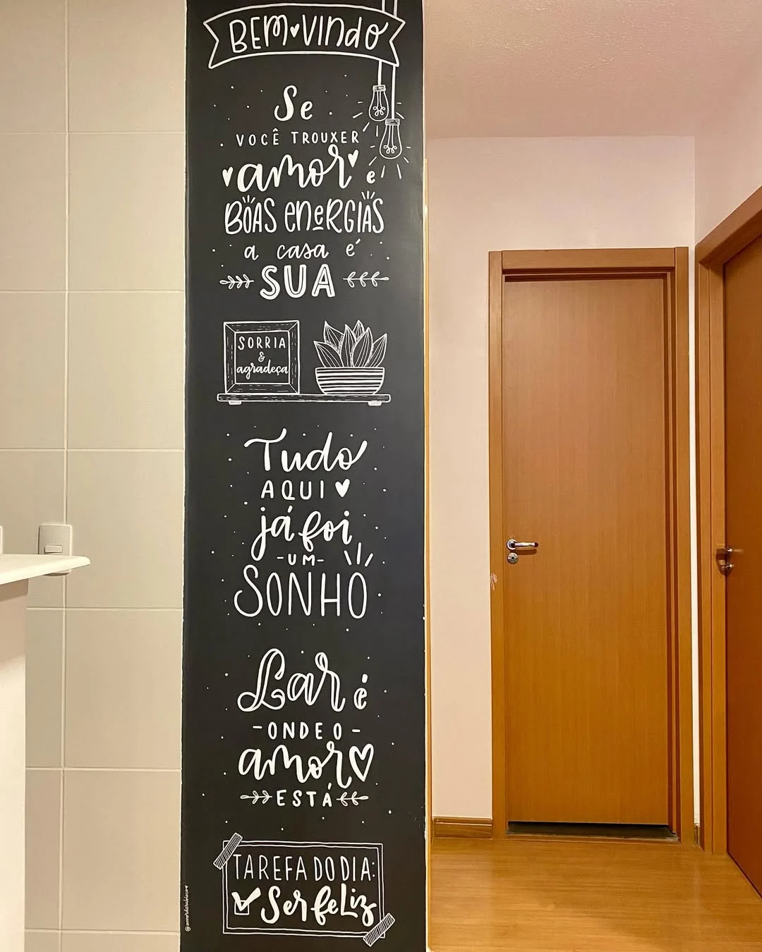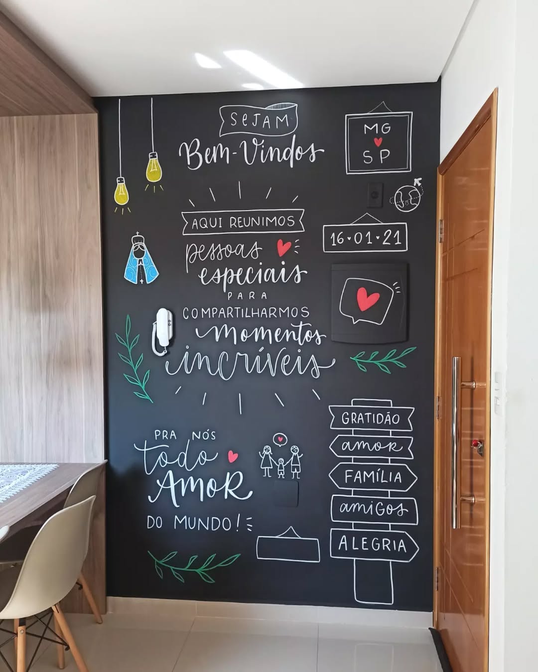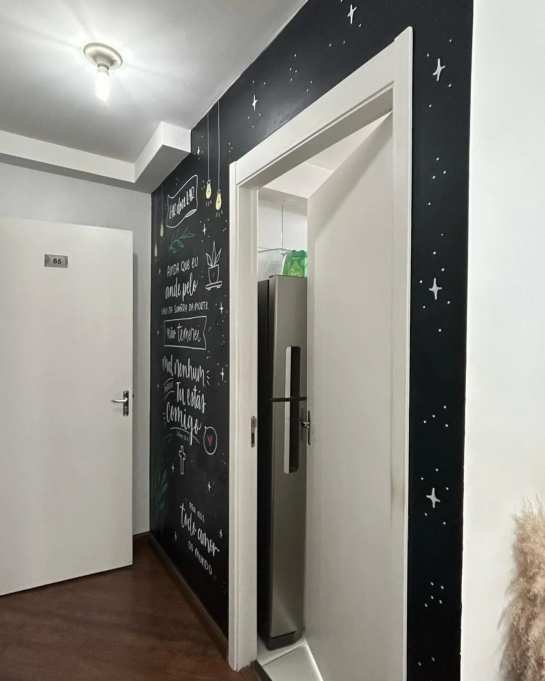 O hall de entrada é um dos melhores lugares para a parede de quadro negro! Como ele é a porta de entrada para casa, dá para brincar bastante com a parte estética. Você pode colocar desde um desenho da sua família até uma frase inspiradora ou do seu filme favorito.