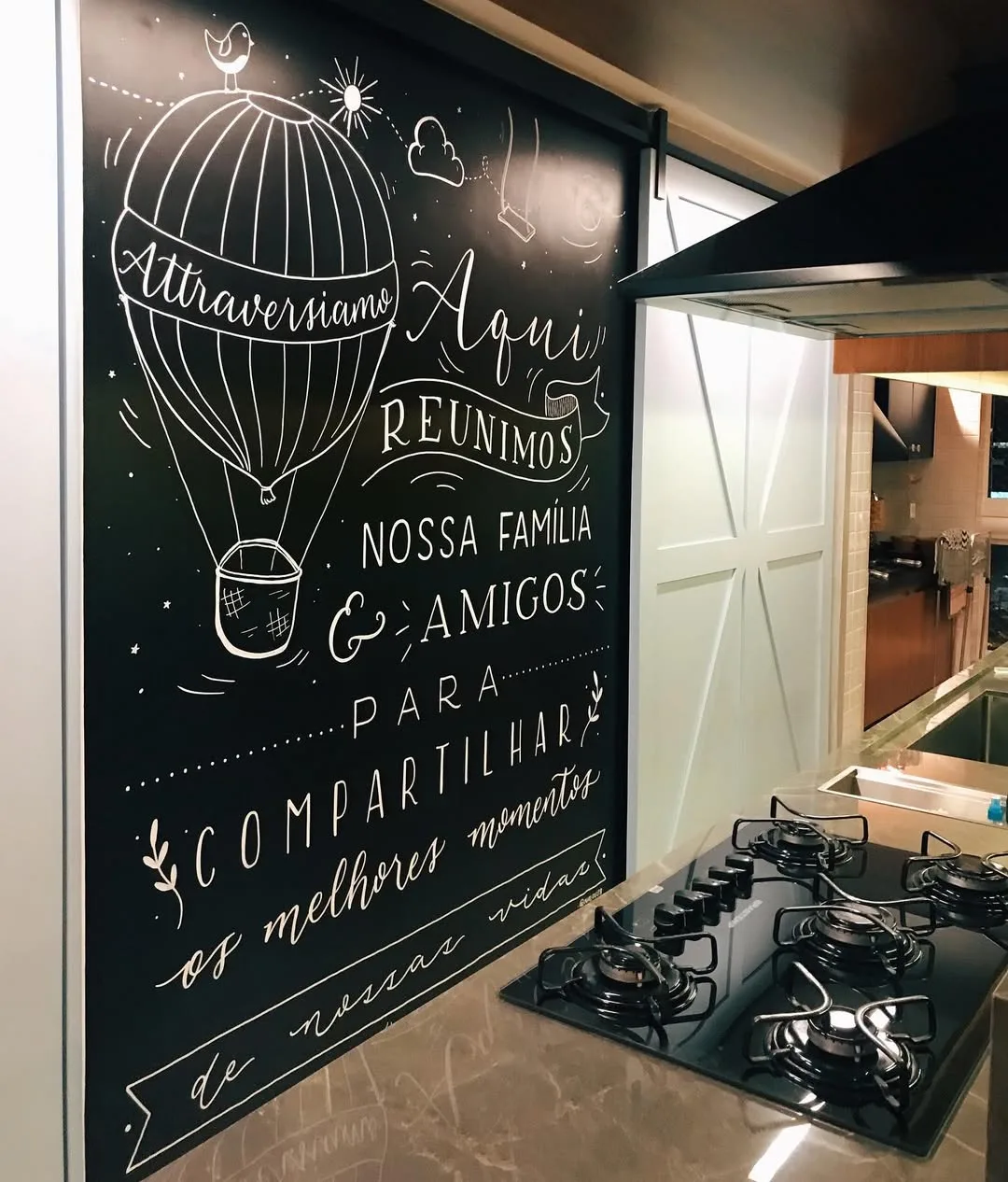 Cozinha com parede de lousa preta, desnehos e receitas próximo do fogão.