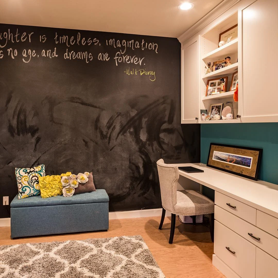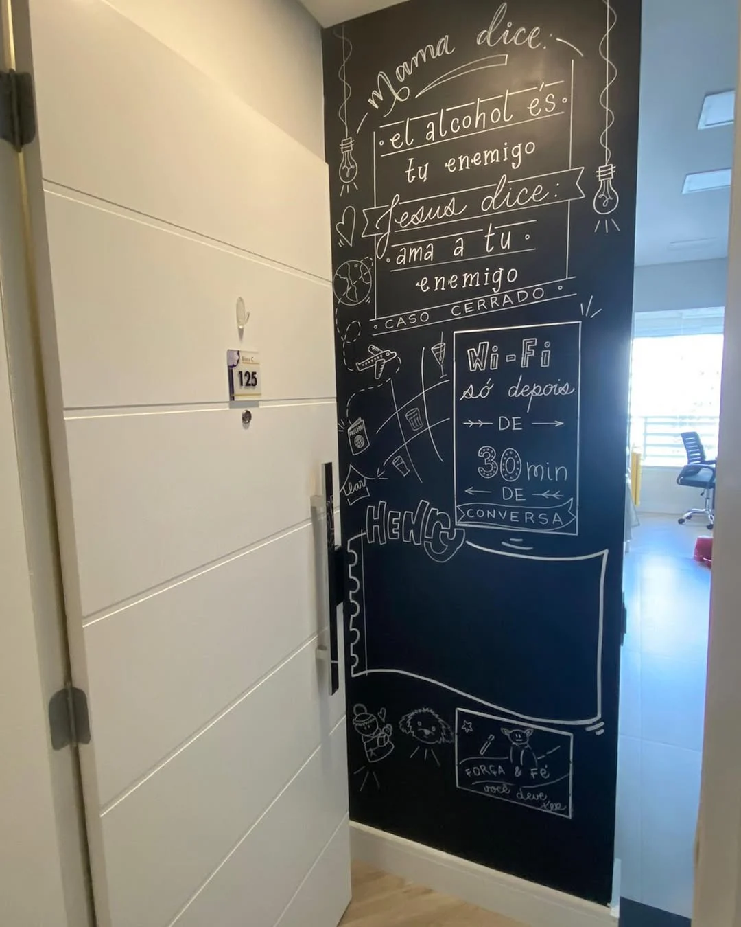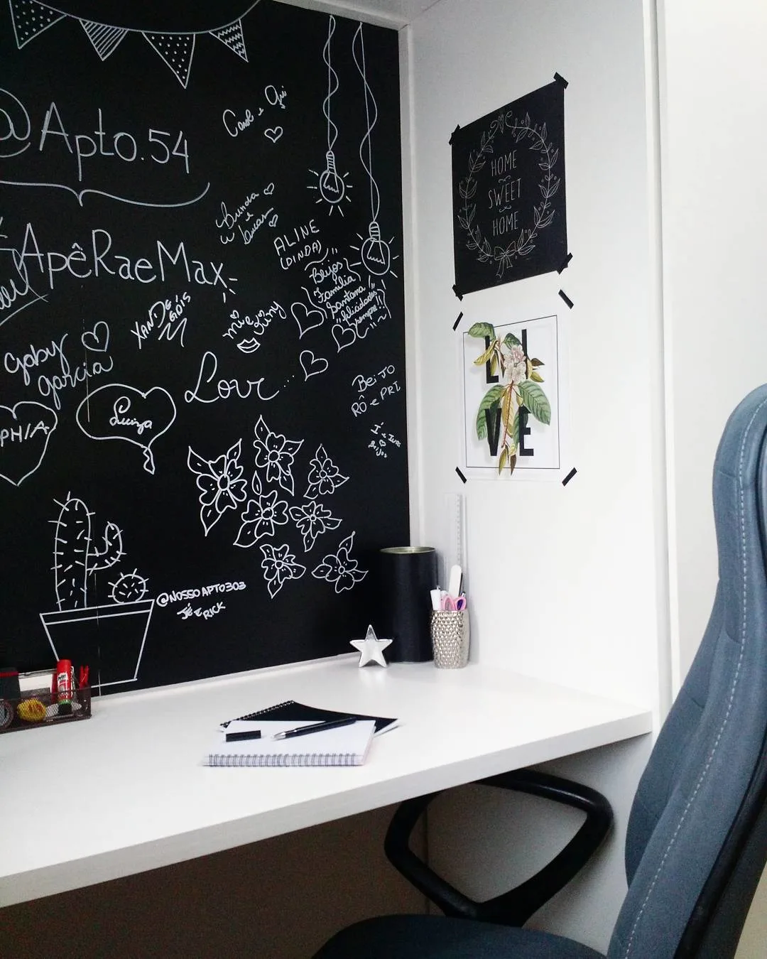 Ela também estimula a produtividade. Seja para planejar a semana, estudar para vestibular ou concurso, ou simplesmente rabiscar ideias, a parede de quadro negro funciona como uma extensão do pensamento.