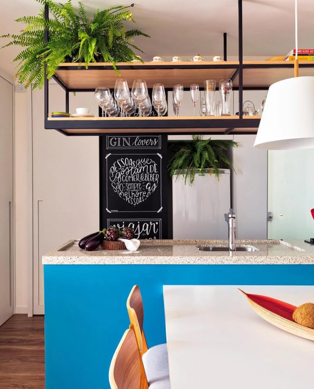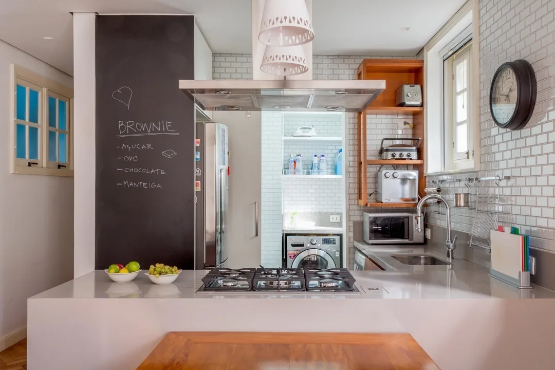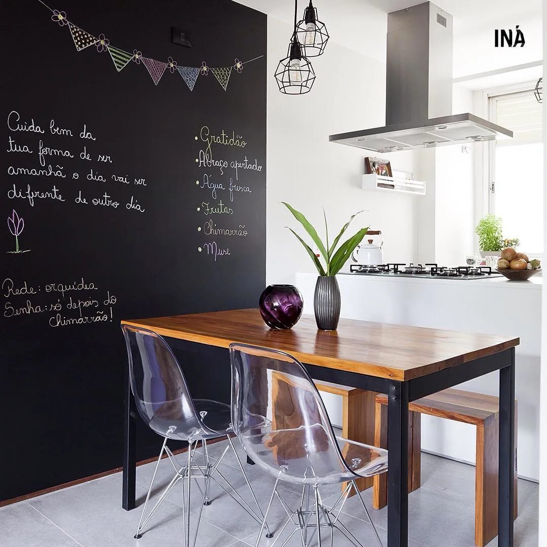 Na cozinha, a parede de quadro negro pode funcionar como uma espécie de painel organizador. Você pode incluir lista de compras, cardápio semanal e lembretes do dia a dia ficam sempre acessíveis. Eu garanto que isso vai facilitar a sua rotina!