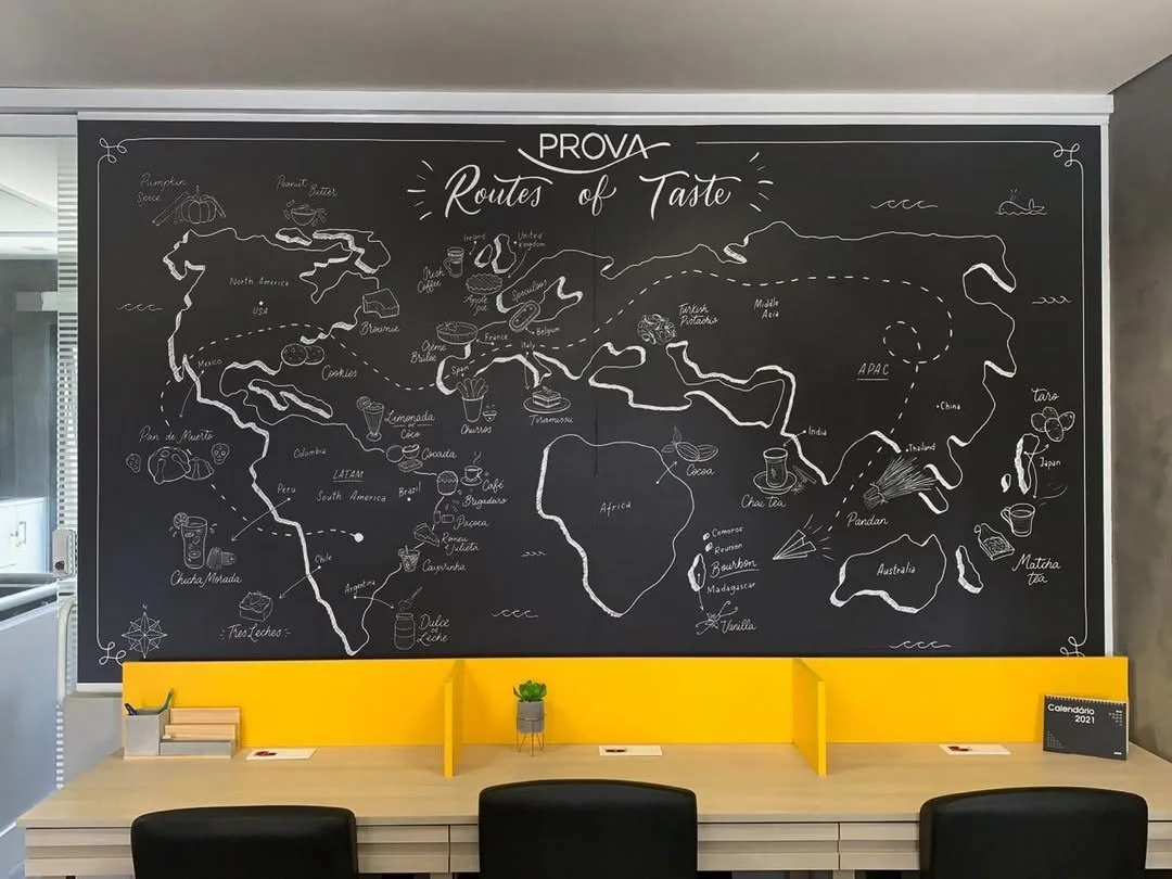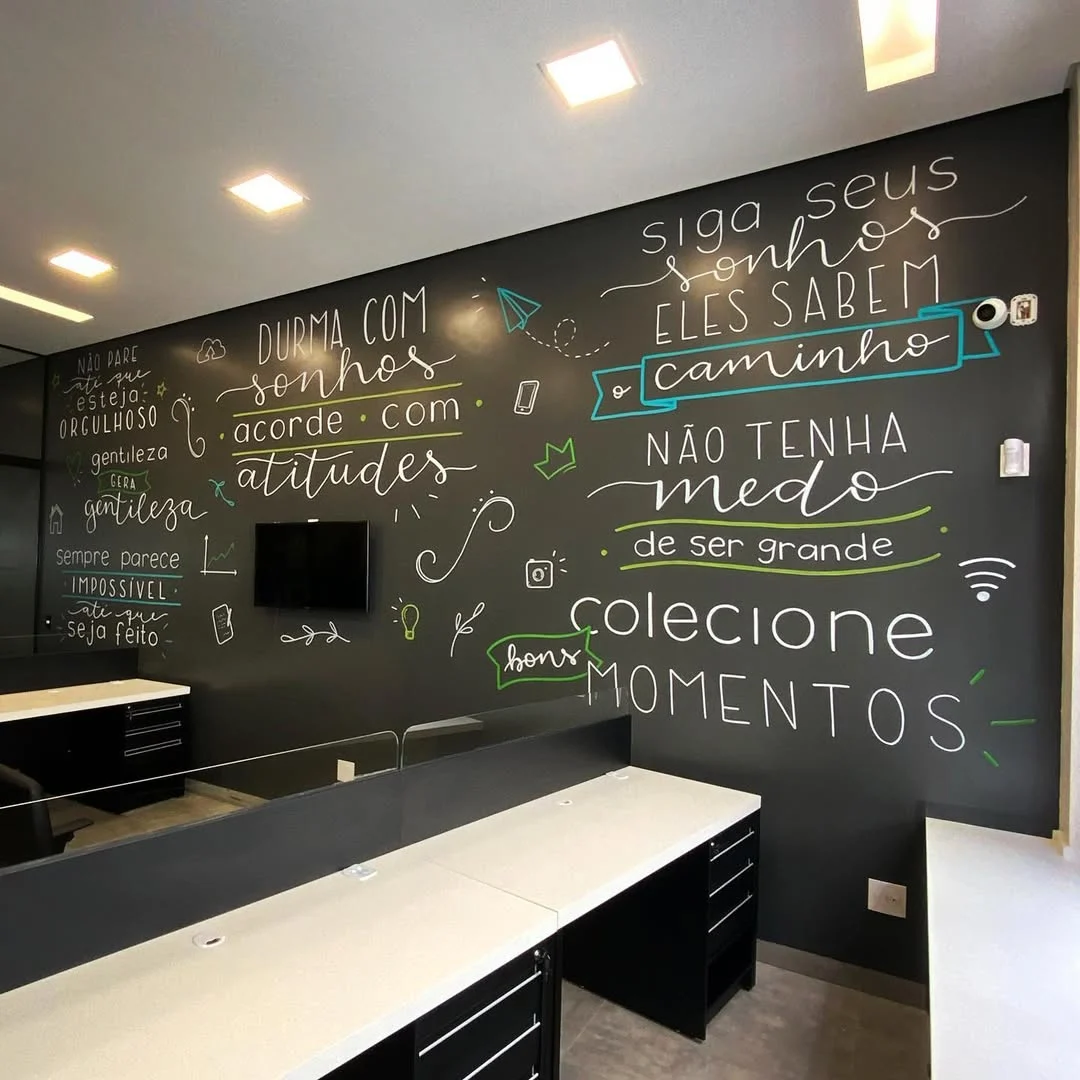 Espaço compartilhado de escritório com lettering na parede de lousa.