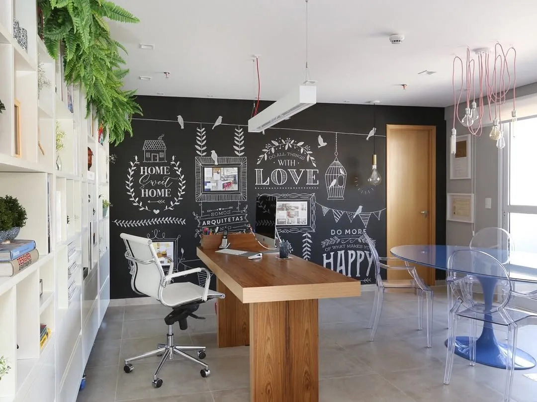 No home office, a parede de quadro negro contribui diretamente para a produtividade. Planejamento semanal, prazos e tarefas prioritárias ficam sempre à vista. Você pode até mesmo colocar um cantinho cheio de post it para deixar mais colorido e destacar aquilo que é mais importante no dia. Dessa forma, dá para organizar demandas sempre que precisar.