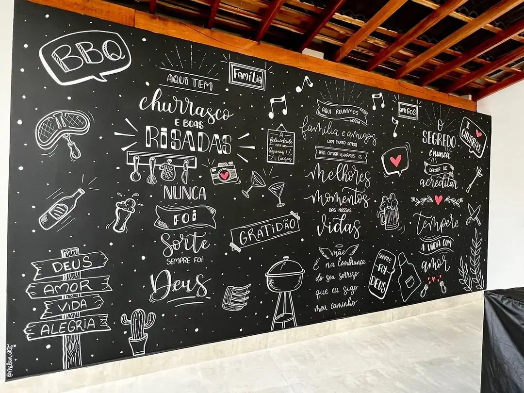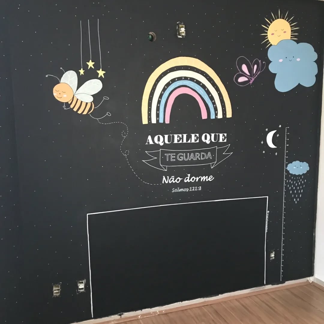 Outro ponto forte é a flexibilidade criativa. Hoje, uma tendência de decoração artística tem sido o lettering, que é feito com desenhos e letras bem bonitas. Você pode mudar a parede conforme a necessidade, apagando ou acrescentando algum detalhe que faça sentido pro momento atual.