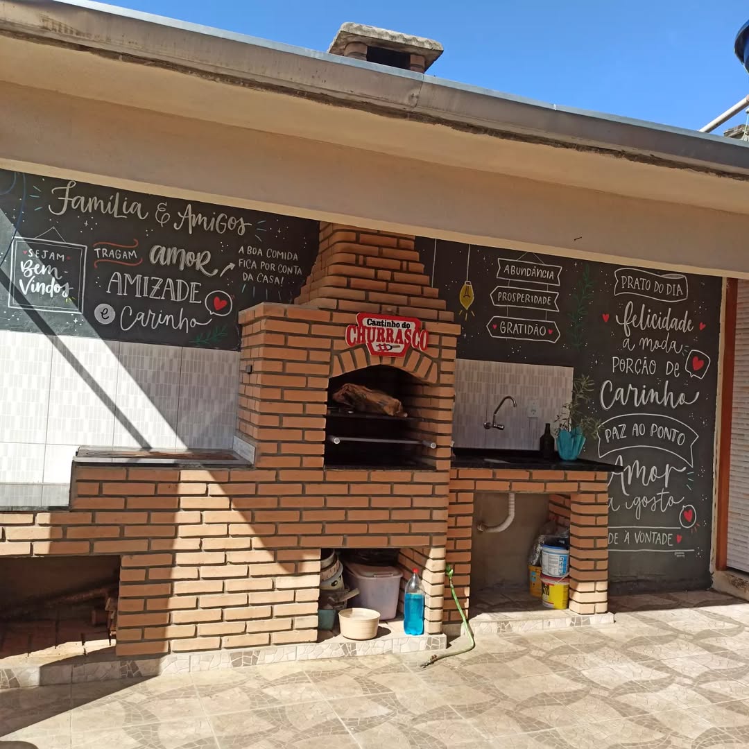 Cozinha gourmet na área de fora de casa com lettering perto da fornalha e churrasqueira.