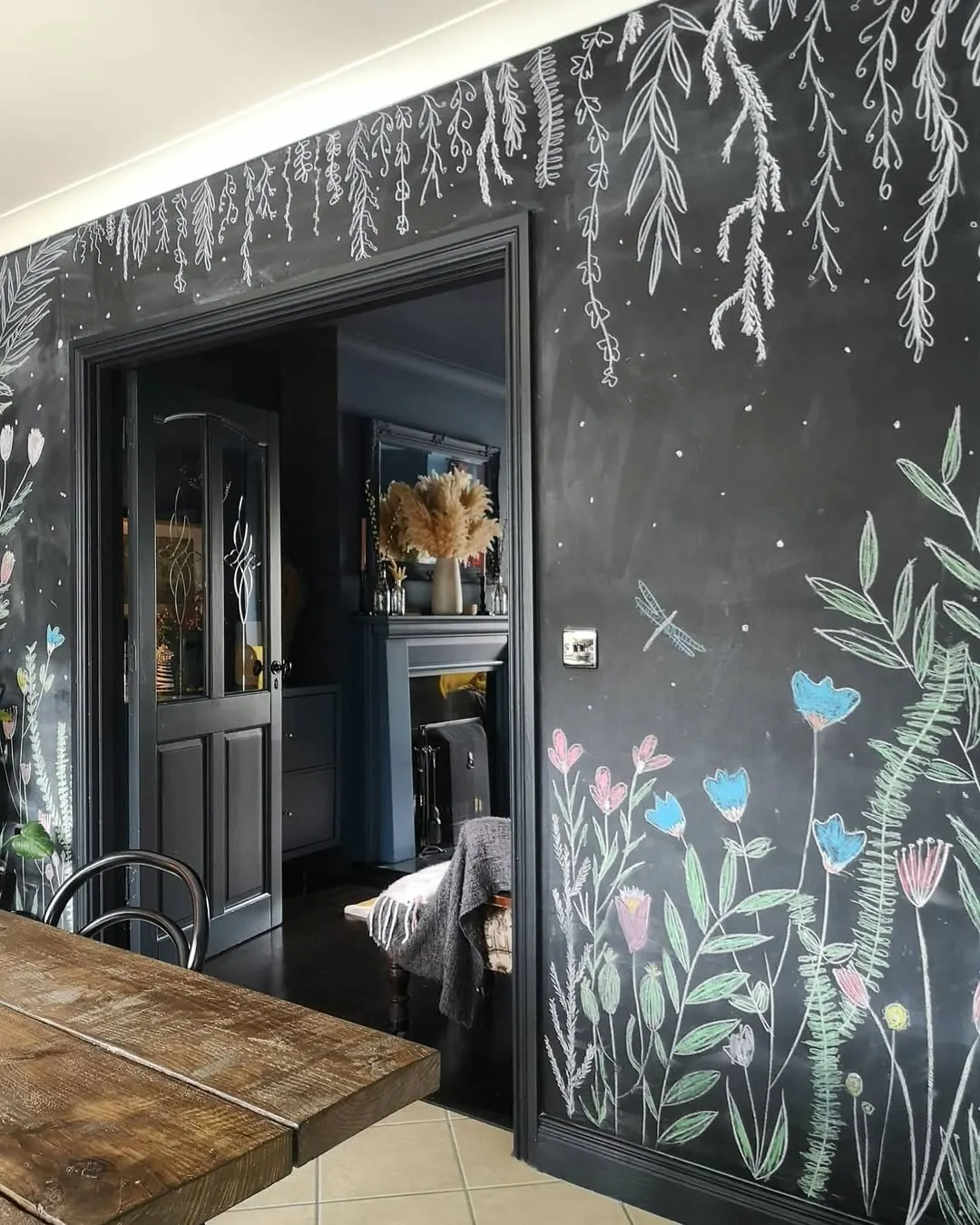 O termo “chalkboard wall” é usado para descrever esse tipo de acabamento no design de interiores. Ele se refere mais à função do que ao formato, permitindo diferentes soluções estéticas. O acabamento costuma ser fosco e levemente poroso.
