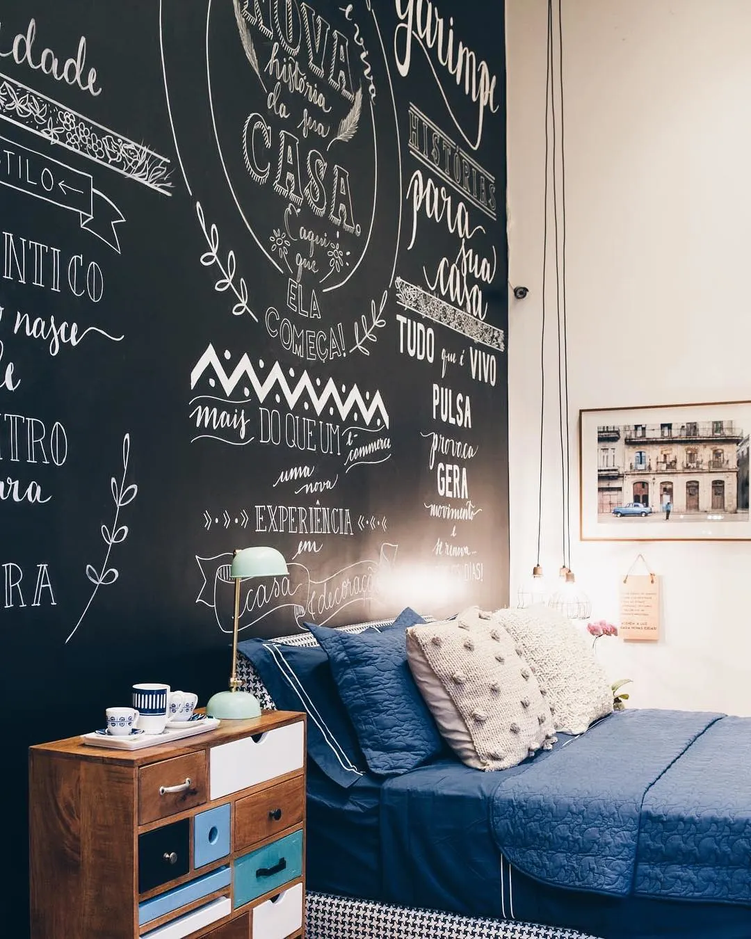 Quarto de adulto com cama e colcha azul, lettering na parede preta de lousa.