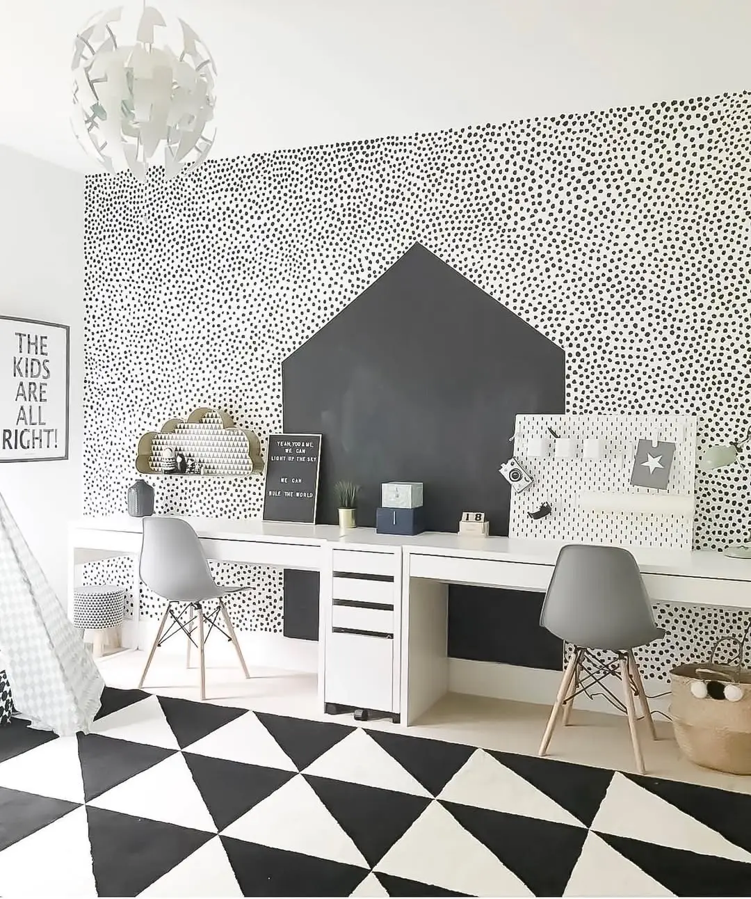 Cantinho de estudo bem lúdico, com estampa de bolinah e casinha na parede.