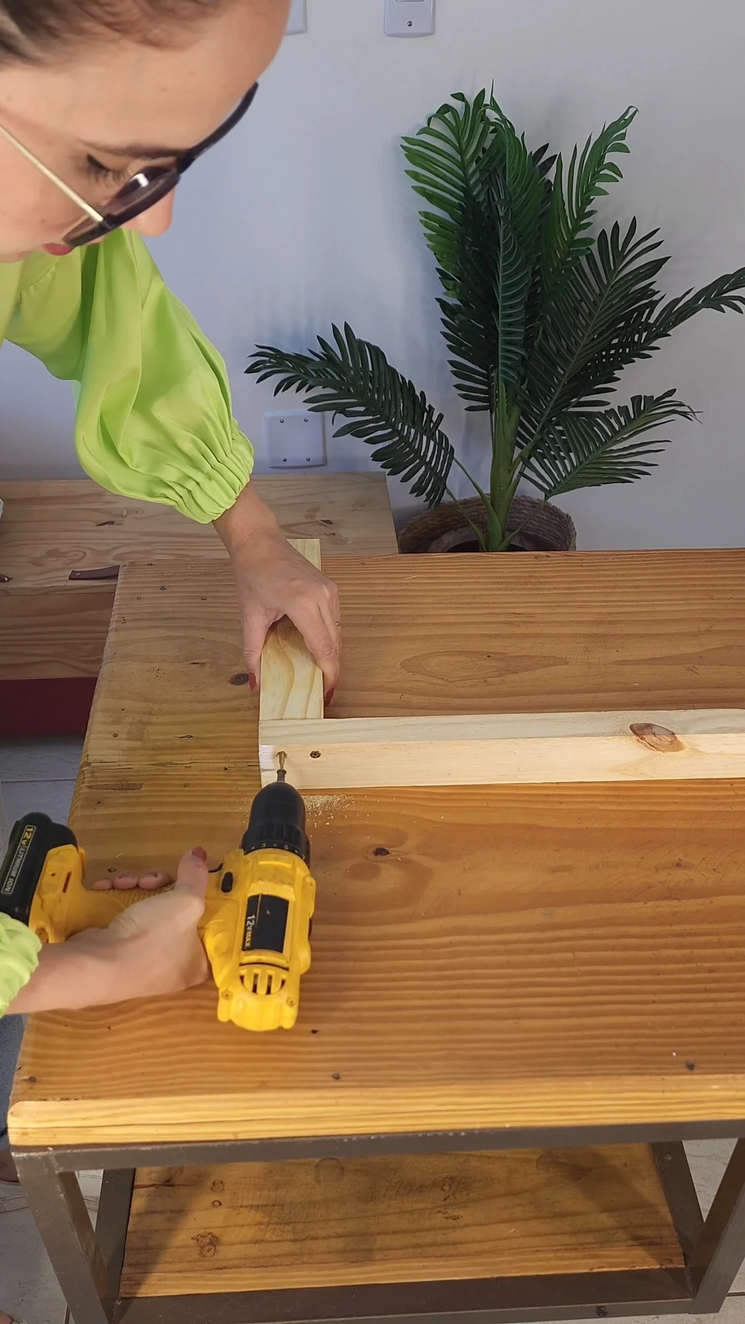 Para começar, cole as ripas menores em uma ripa maior usando cola de madeira. Uma dica bem legal é medir a distância de cada ripa para tudo ficar bem certinho. Depois, reforce a base com parafusos usando a parafusadeira, garantindo firmeza para a estrutura.