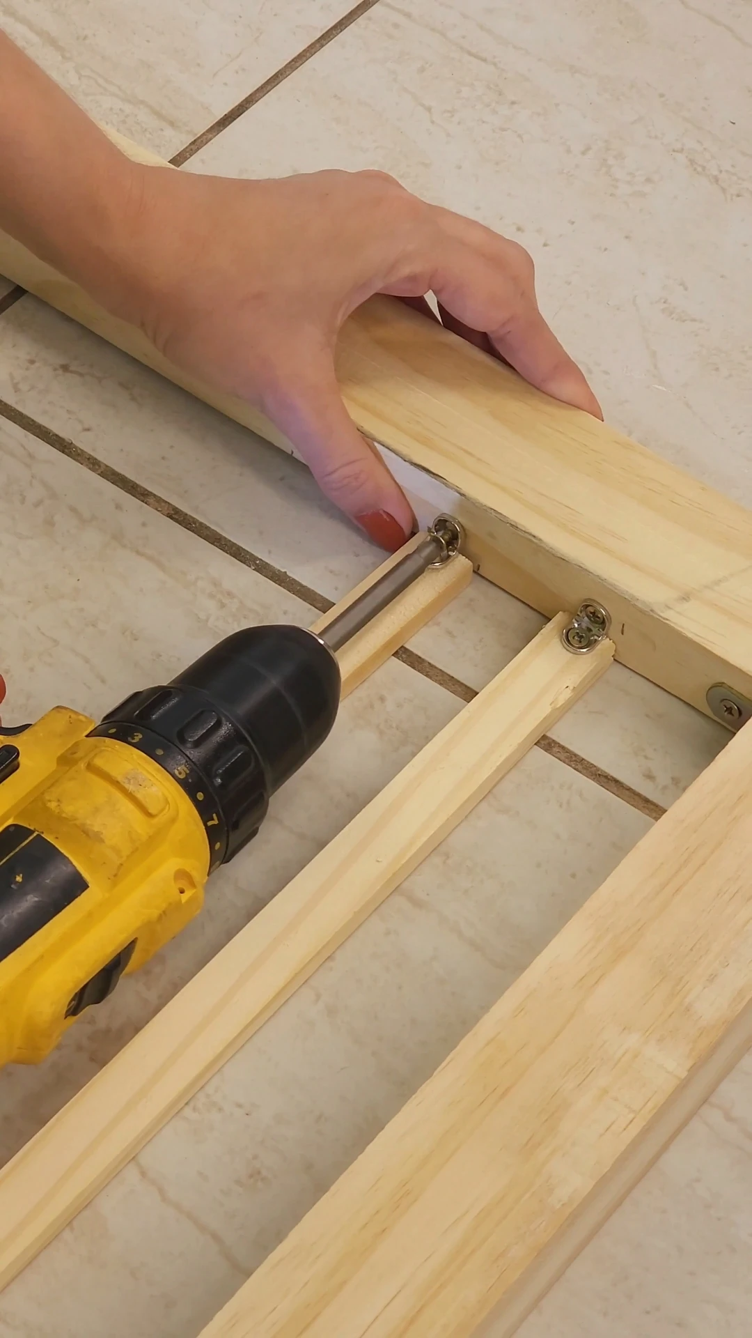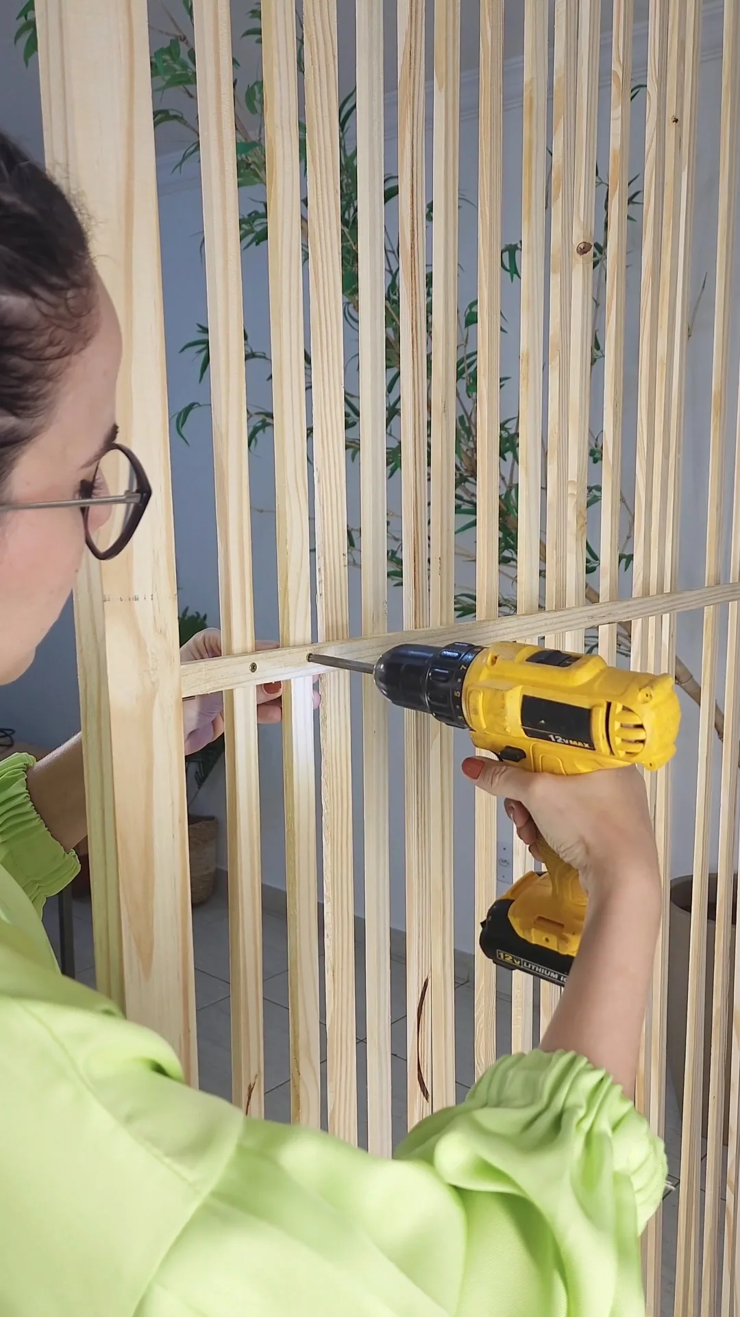 Passo 5: finalize sua divisória de ambientes para casa de aluguelParafusando as ripas em uma ripa horizontal para dar mais firmeza.