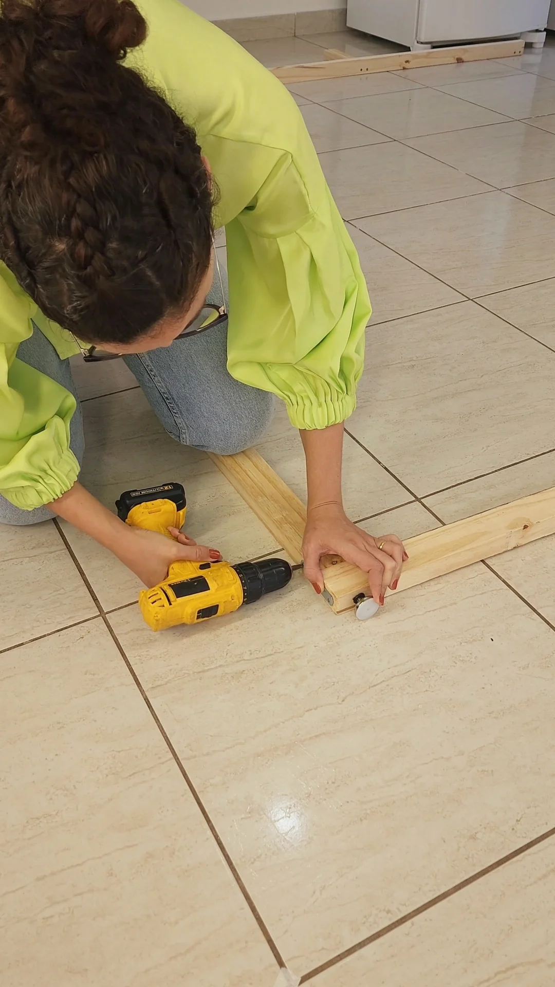 Nessa etapa, parafuse uma ripa na lateral da base usando cantoneiras e união chata e, depois, repita esse processo na parte de cima. A intenção aqui é formar um grande quadrado, que será a estrutura principal da divisória.