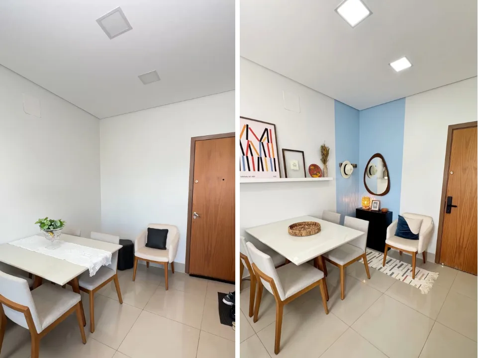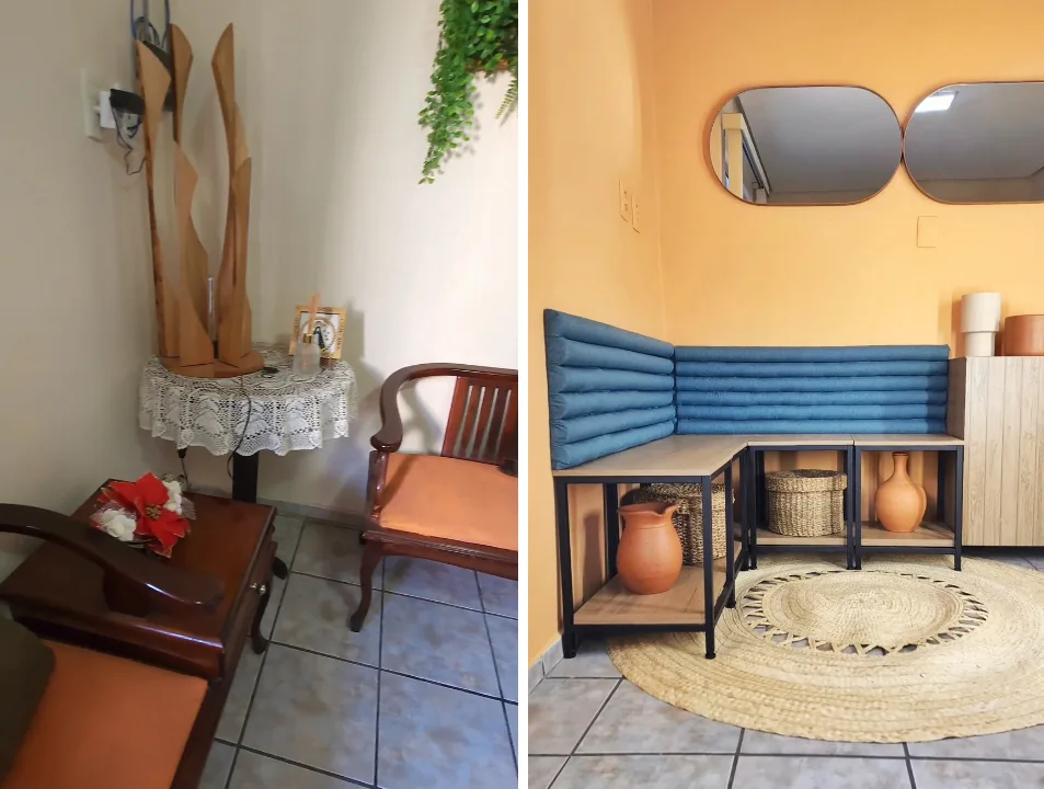 A minha tia tinha um cantinho da sala que estava sem graça, apagado e pedindo por uma mudança. Era aquele tipo de espaço que a gente passa e pensa “falta alguma coisa aqui”. Então, para transformar a sala dela, eu pensei em trazer um pouco mais de alegria para o ambiente. A proposta foi criar algo simples, mas que tivesse impacto imediato.