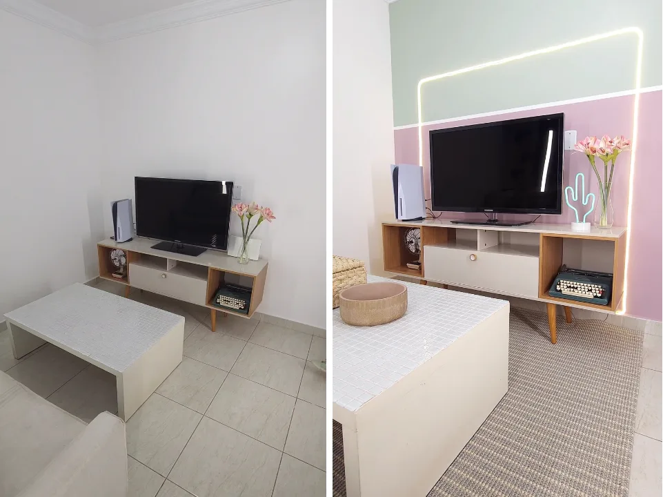 Depois da pintura, coloquei uma fita de LED para demarcar a área da televisão. Esse detalhe é simples, mas faz muita diferença! Ele deixa o cantinho super moderno e destaca esse espaço especial da sala.