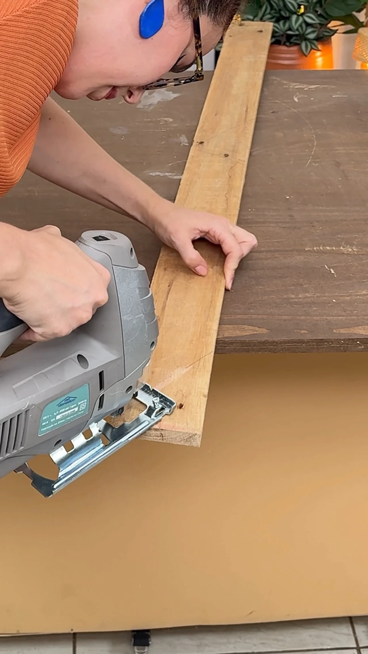 Além dos cortes retos, eu também fiz um corte diagonal em algumas ripas. Esse corte diagonal ajuda muito no design final da peça, deixando o visual mais moderno e criando uma sensação de movimento na estrutura da mesa. Eu fiz esse corte usando a serra tico-tico, mas você pode usar um serrote comum que também funciona.