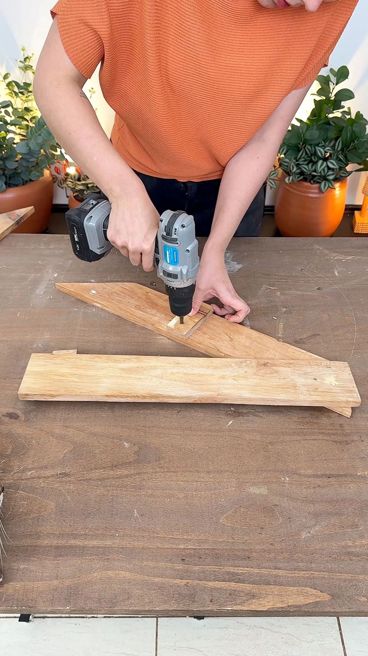 Para fazer a estrutura, comece posicionando duas ripas de madeira formando um V. Aqui, você pode deixar ele um pouco mais fechado em um dos lados. Essas duas ripas vão funcionar como base inicial, então garanta que estejam bem posicionadas antes de parafusar!