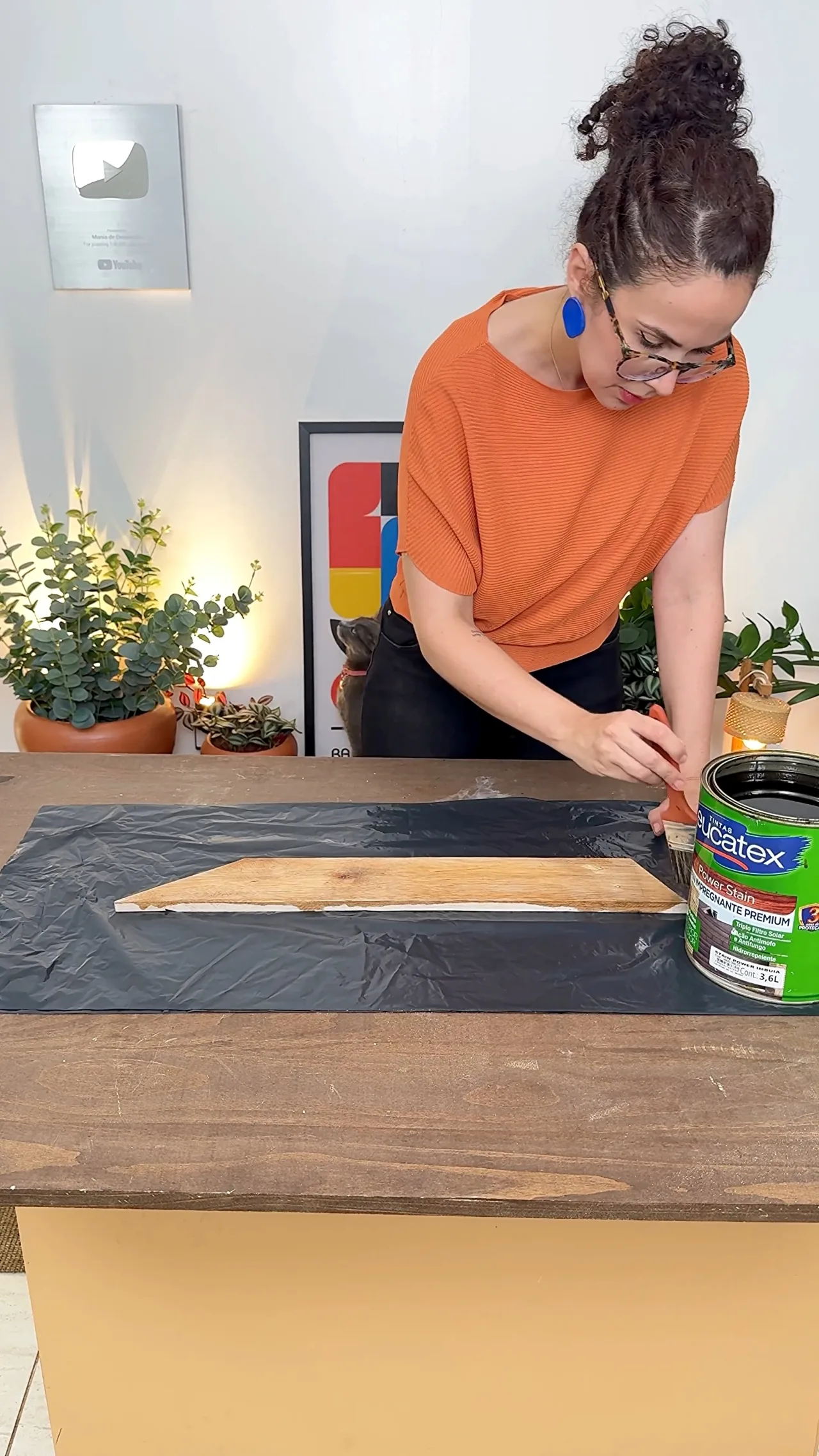 Depois de lixar, apliquei o stain. Ele é uma resina impregnante que protege a madeira sem criar uma camada grossa. Além da proteção, o stain também altera o tom da madeira, deixando tudo mais uniforme e bonito. No meu caso, usei a cor Imbua da Eucatex e o resultado deixou a madeira com um tom amadeirado suave.