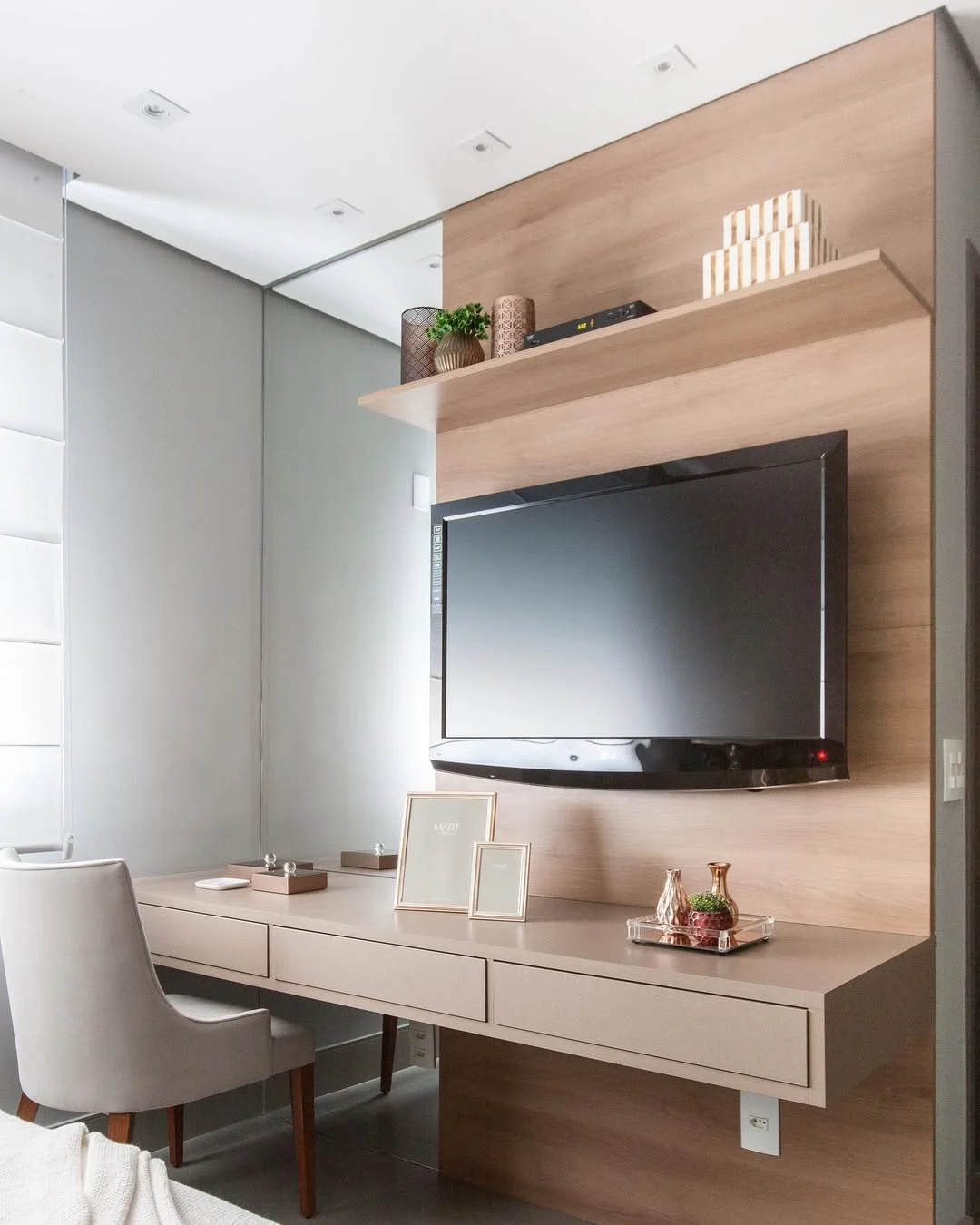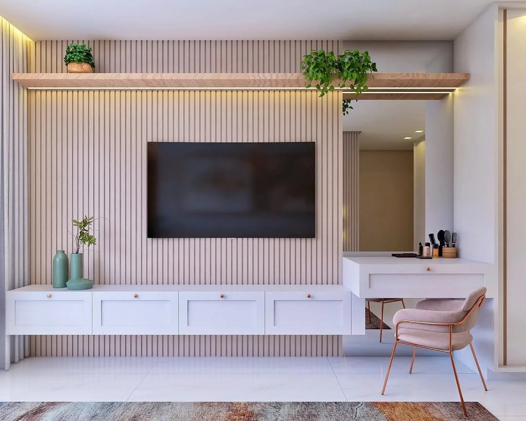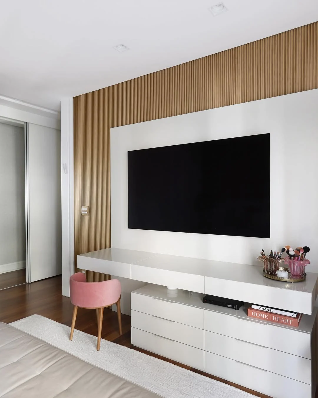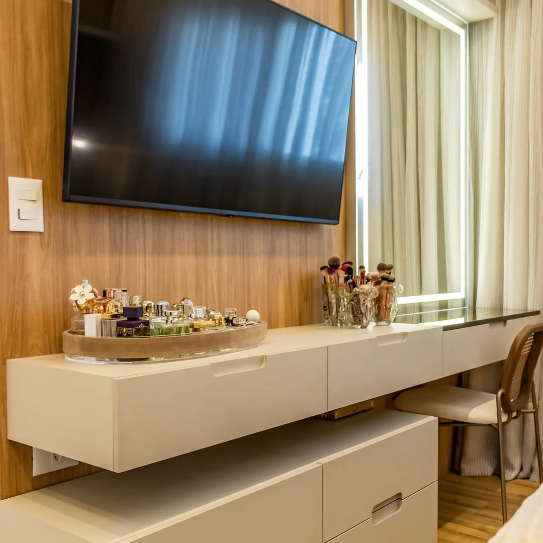 Penteadeira na sala de tv com espelho grande no painel com luz de LED embutida.