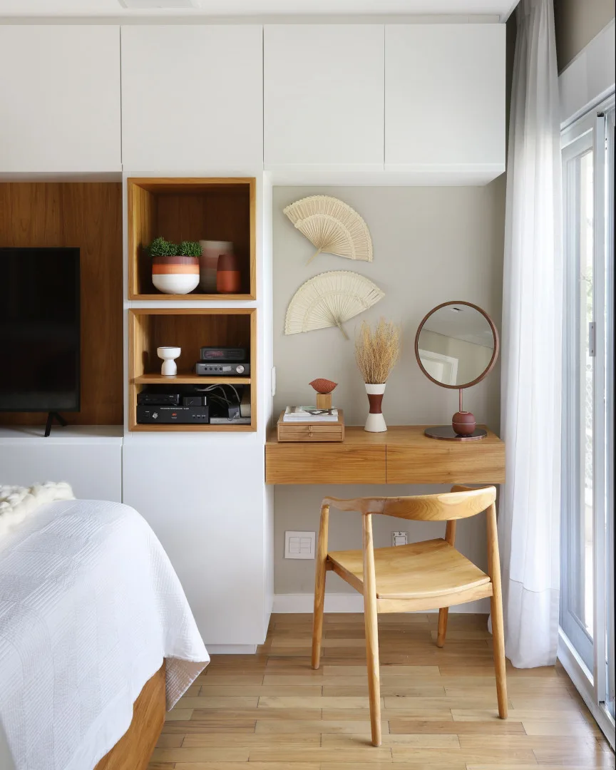 Home office compartilhado com penteadeira, detalhes em madeira clara e com plantas.