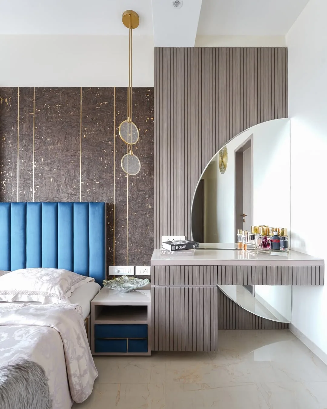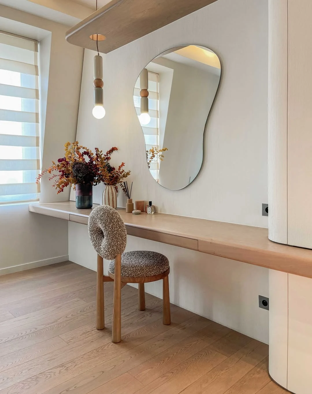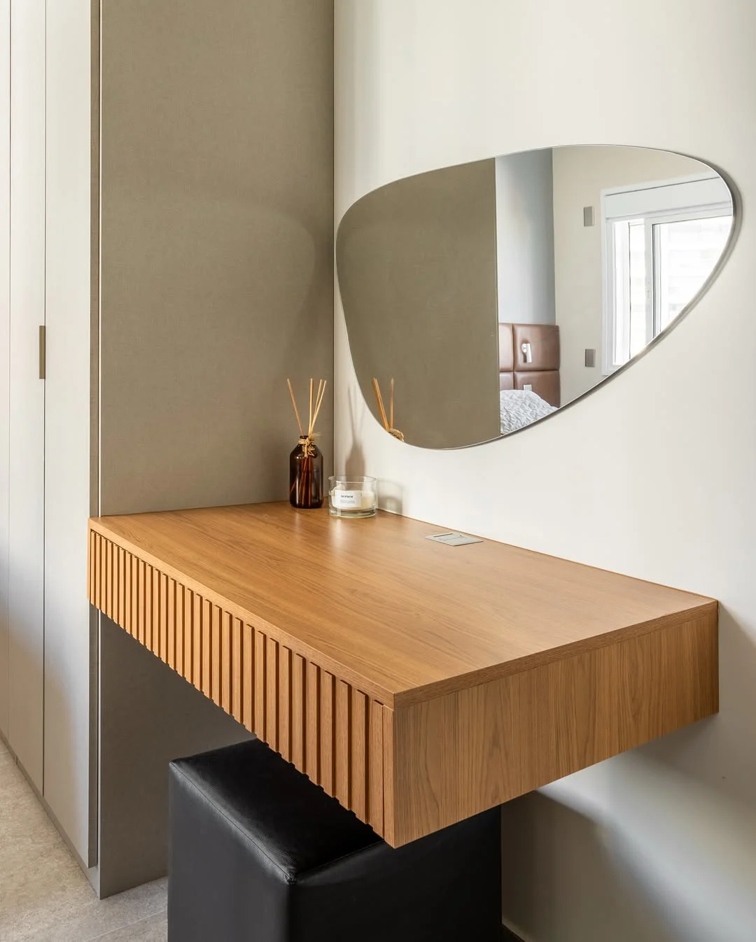 Penteadeira suspensa com espelho orgânico e efeito ripado.