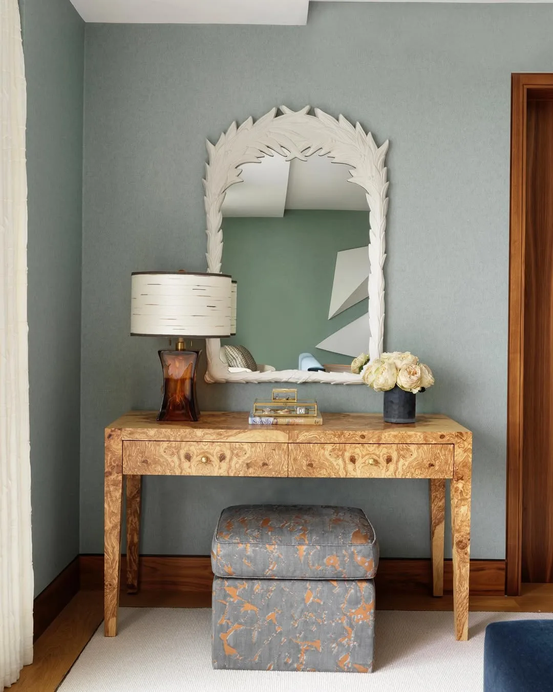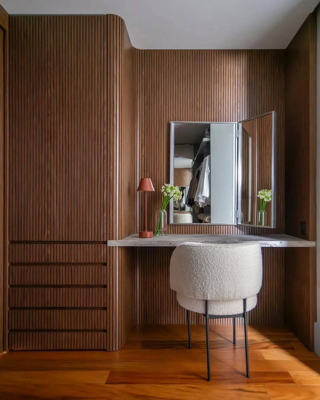 Em 2026, uma das tendências que mais está ganhando força é a volta da decoração acolhedora. Para isso, você pode apostar em materiais de textura natural, como madeira e bambu. Eles vão trazer um toque mais convidativo para a sua penteadeira e deixar ela com um visual bem bonito!