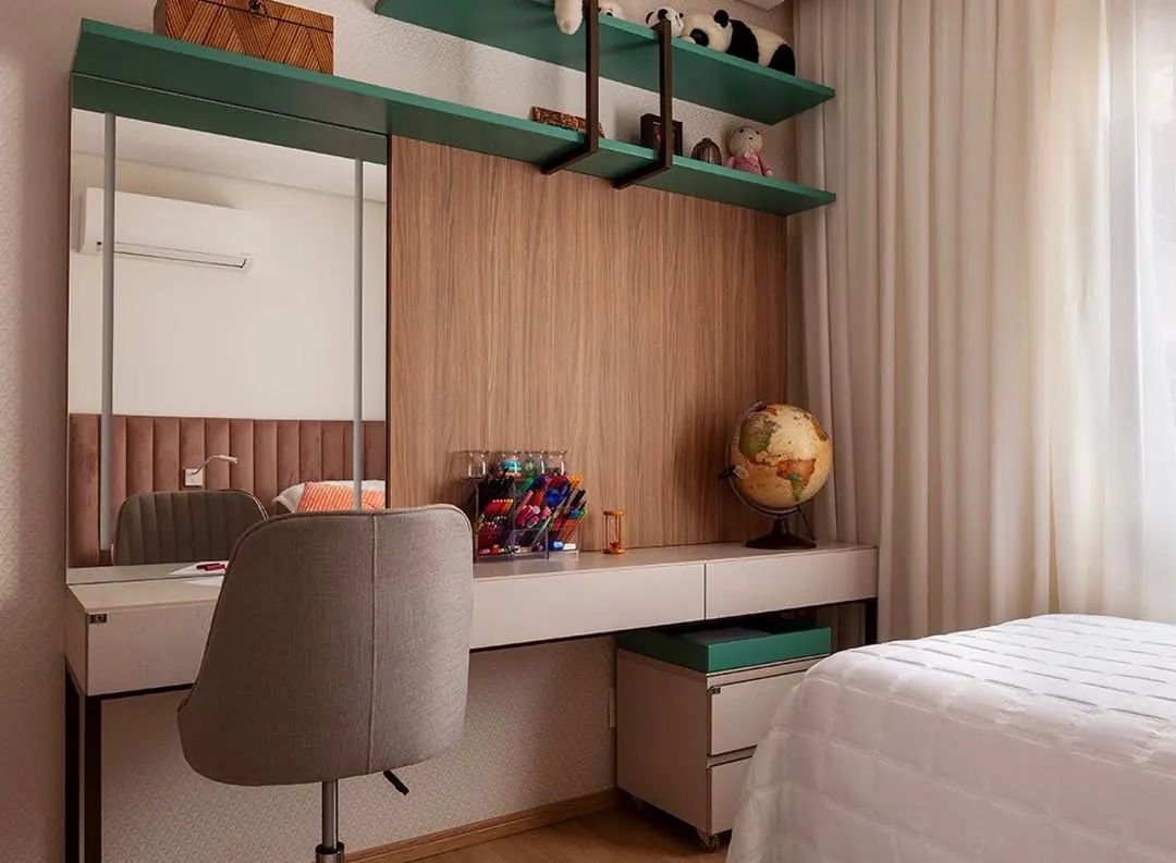 Penteadeira e espaço de home office com detalhes verdes e espaço organizado.