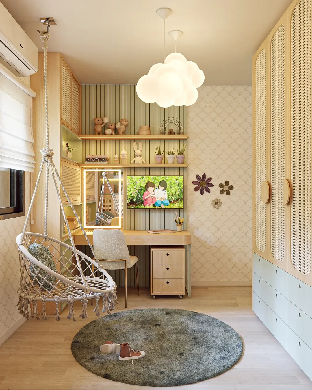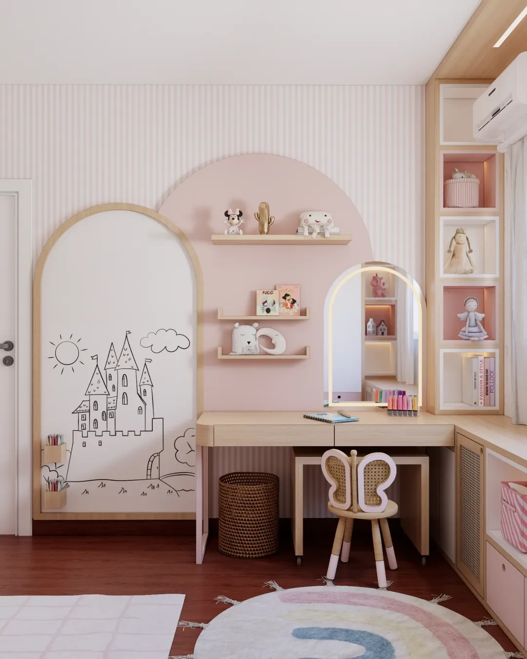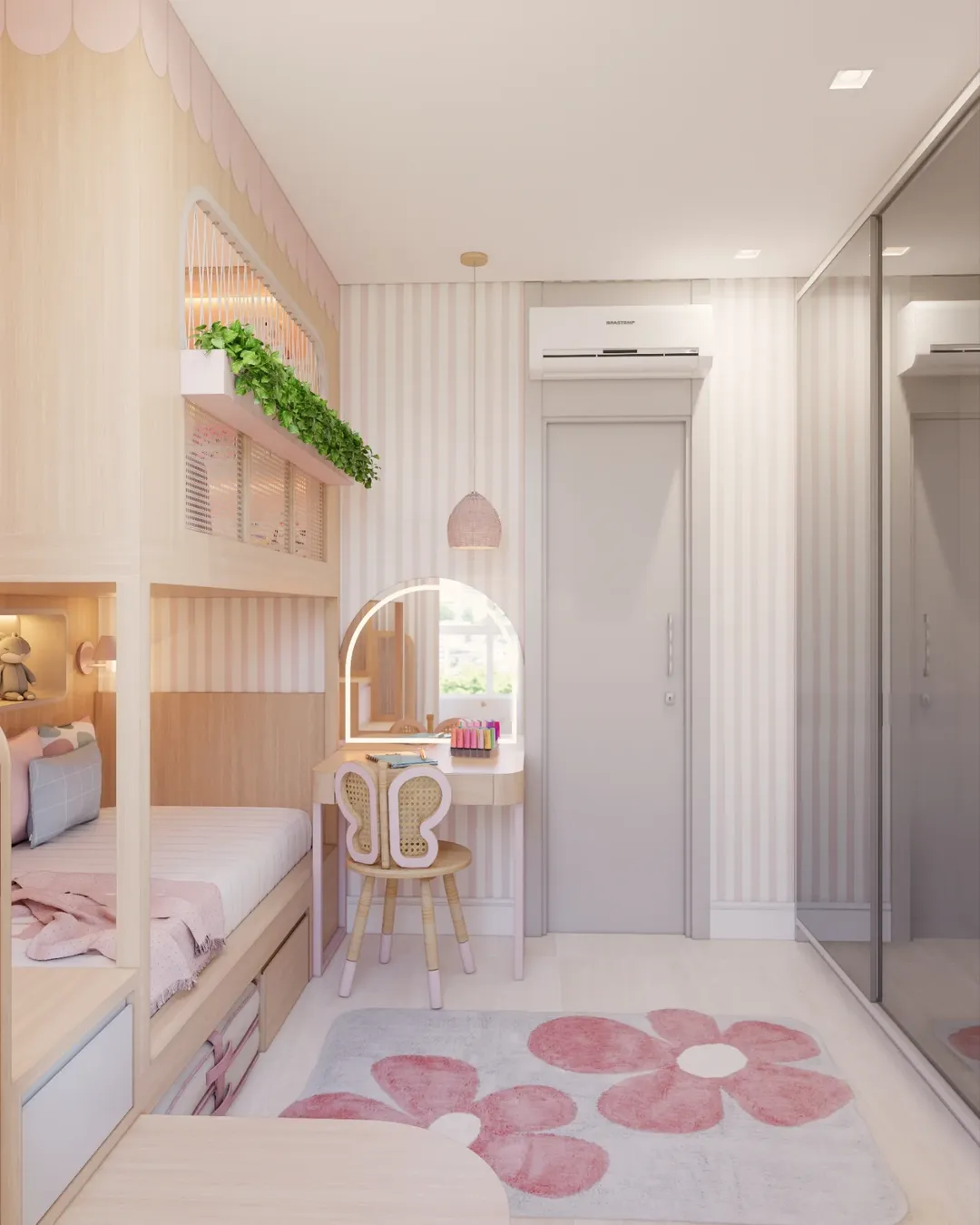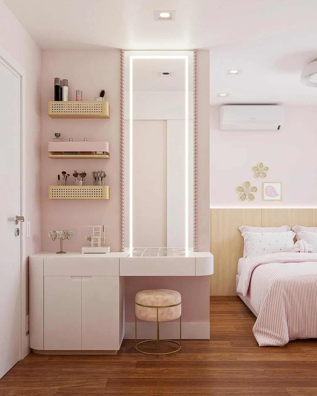 Se você tiver apenas uma escrivaninha também, você pode transformá-la em uma penteadeira com espelho. Aqui, dá para instalar um espelho na parede e montar a sua decoração dos sonhos.