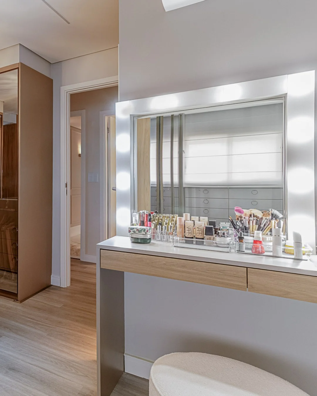 Outra possibilidade interessante é apostar em espelhos com iluminação de LED embutida. Isso já vai trazer um toque a mais de modernidade para a penteadeira e te permite controlar a luz também.