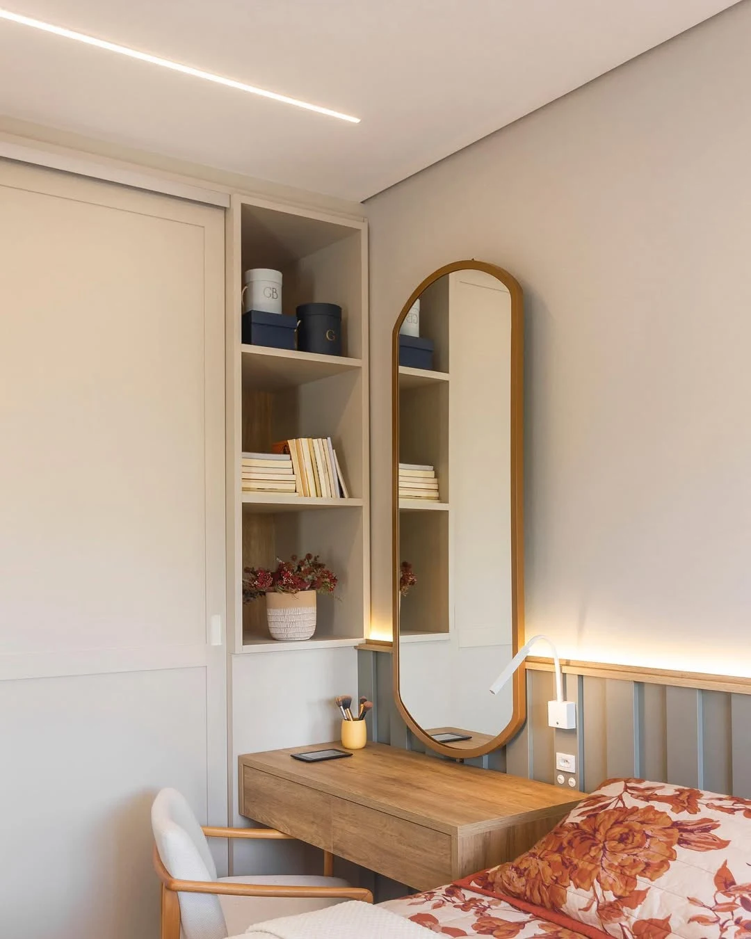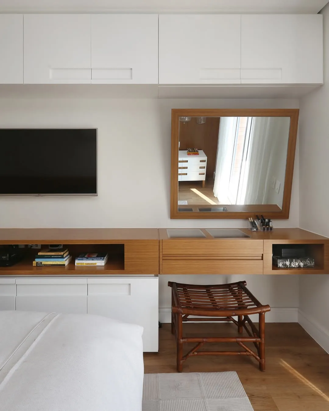 Uma penteadeira que seja dois em um, com um compartimento para esconder o espelho, também costuma ser uma alternativa excelente para esse tipo de situação. Ou, ainda, dá para colocar um espelho escorado na parede sempre que necessário, apesar de ser menos prático no dia a dia.