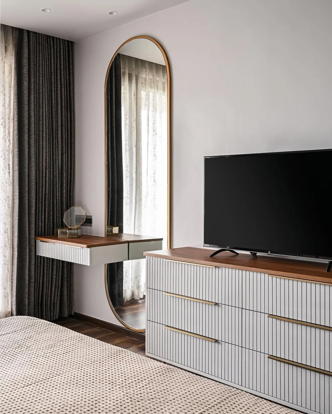 Penteadeira camarim no quarto branco, com espelho em formato de arco, folhas secas e estante com planta.