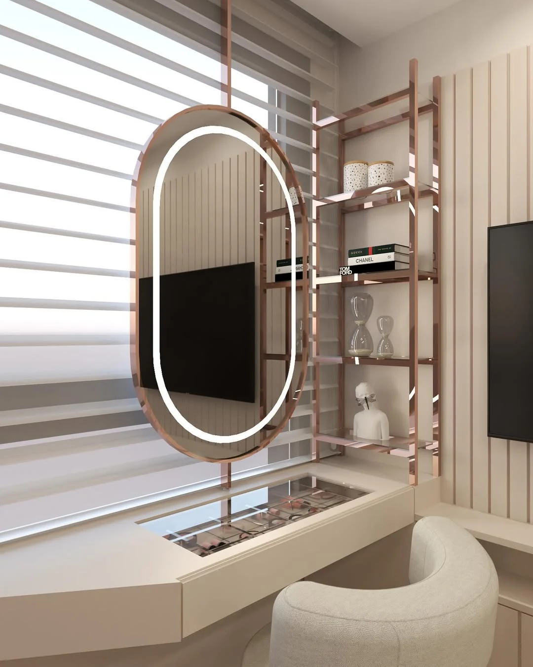 Penteadeira com LED e espelho oval, detalhes metálicos rose gold.