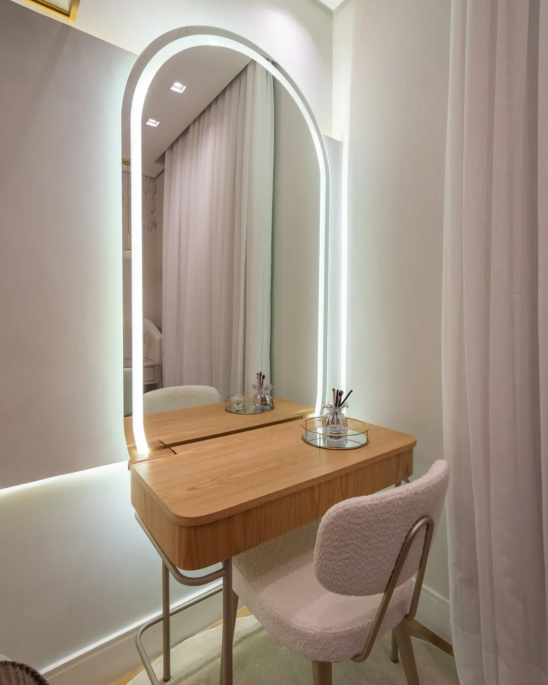 Penteadeira com espelho em formato de arco e LED embutido na cor branca.